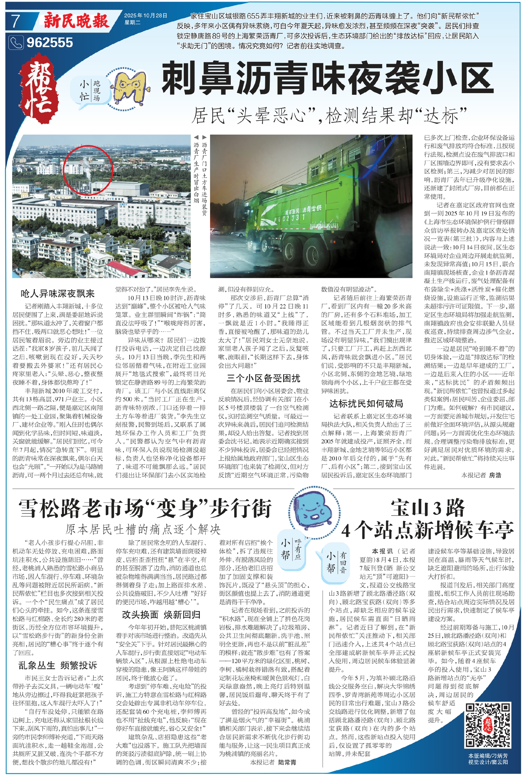 家住宝山区城银路655弄丰翔新城的业主们,近来被刺鼻的沥青味缠上了。他们向“新民帮侬忙”反映,多年来小区偶有异味萦绕,可自今年夏天起,异味愈发浓烈,甚至频频在深夜“突袭”。居民们排查锁定静唐路89号的上海繁荣沥青厂,可多次投诉后,生态环境部门给出的“排放达标”回应,让居民陷入“求助无门”的困境。情况究竟如何?记者前往实地调查。
