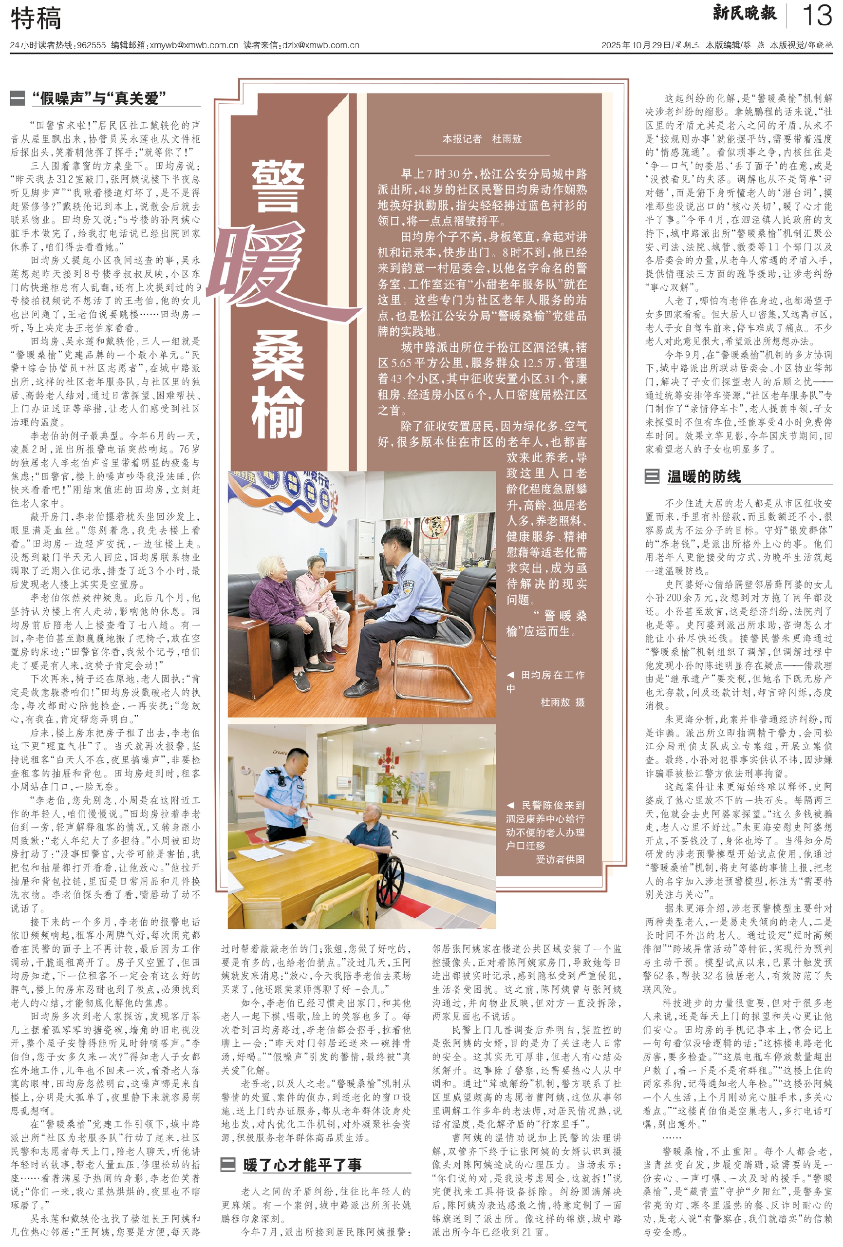 这起纠纷的化解,是“警暖桑榆”机制解决涉老纠纷的缩影。拿姚鹏程的话来说,“社区里的矛盾尤其是老人之间的矛盾,从来不是‘按规则办事’就能摆平的,需要带着温度的‘情感疏通’。看似琐事之争,内核往往是‘争一口气’的委屈、‘丢了面子’的在意,或是‘没被看见’的失落。调解也从不是简单‘评对错’,而是俯下身听懂老人的‘潜台词’,摸准那些没说出口的‘核心关切’,暖了心才能平了事。”今年4月,在泗泾镇人民政府的支持下,城中路派出所“警暖桑榆”机制汇聚公安、司法、法院、城管、教委等11个部门以及各居委会的力量,从老年人常遇的矛盾入手,提供情理法三方面的疏导援助,让涉老纠纷“事心双解”。