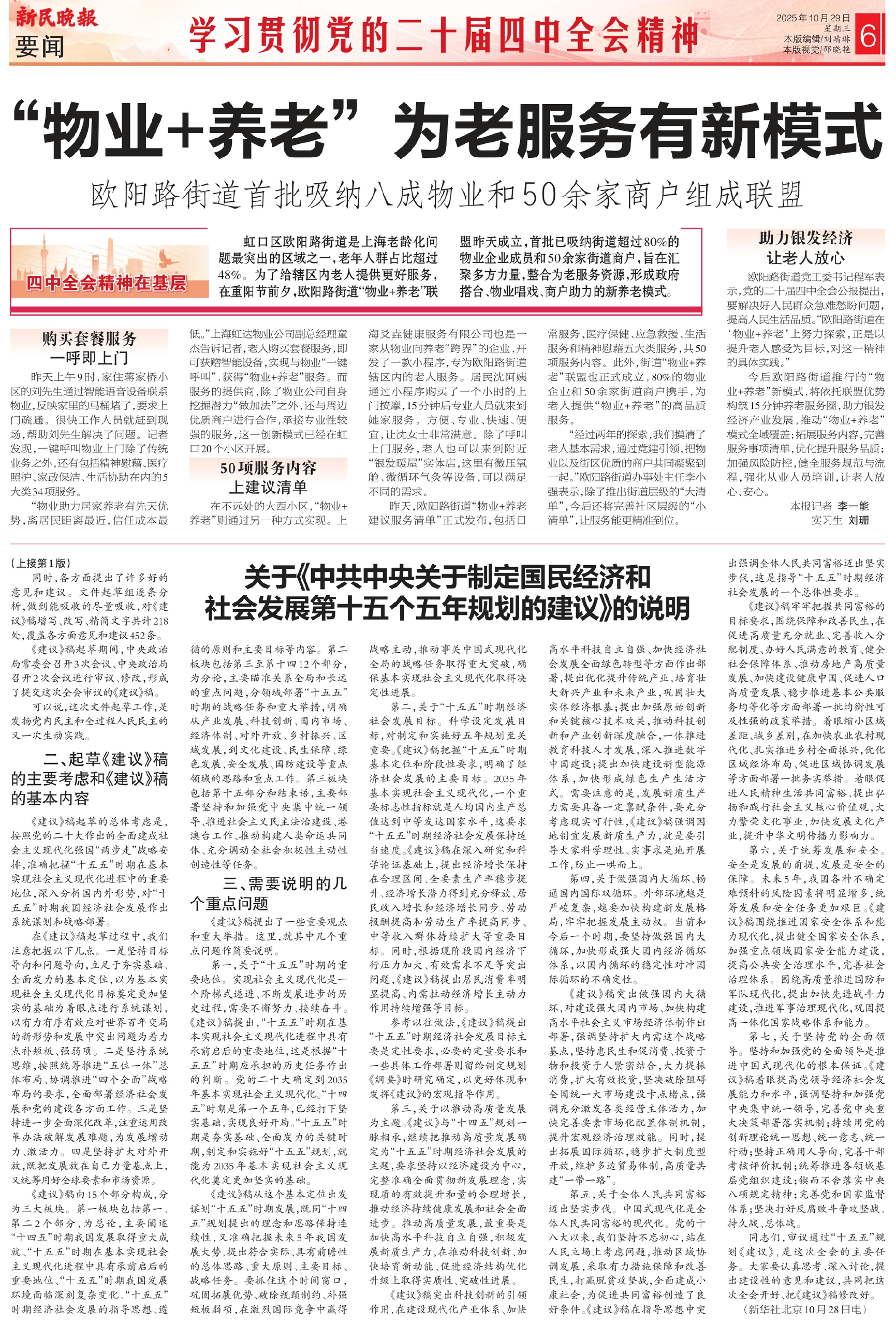 欧阳路街道党工委书记程军表示,党的二十届四中全会公报提出,要解决好人民群众急难愁盼问题,提高人民生活品质。“欧阳路街道在‘物业+养老’上努力探索,正是以提升老人感受为目标,对这一精神的具体实践。”