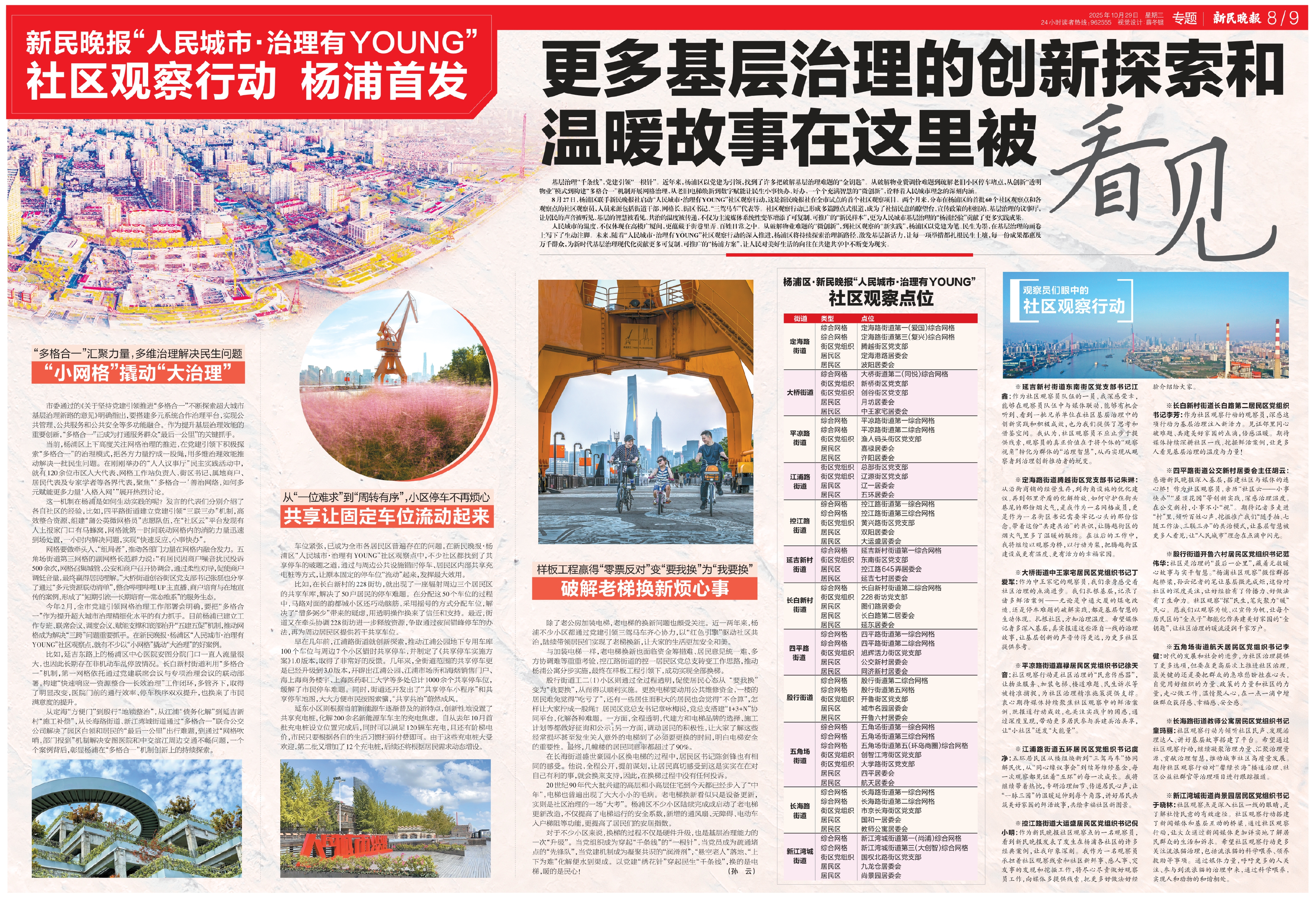 8月27日,杨浦区联手新民晚报社启动“人民城市·治理有YOUNG”社区观察行动,这是新民晚报社在全市试点的首个社区观察项目。两个月来,分布在杨浦区的首批60个社区观察点和各观察点的社区观察员,人员来源包括街道干部、网格长、街区书记、“三驾马车”代表等。社区观察行动已形成多篇蹲点式报道,成为了社情民意的瞭望台、宣传政策的枢纽站、基层治理的议事厅,让居民的声音被听见、基层的智慧被看见、共治的温度被传递,不仅为主流媒体系统性变革增添了可复制、可推广的“新民样本”,更为人民城市基层治理的“杨浦经验”贡献了更多实践成果。