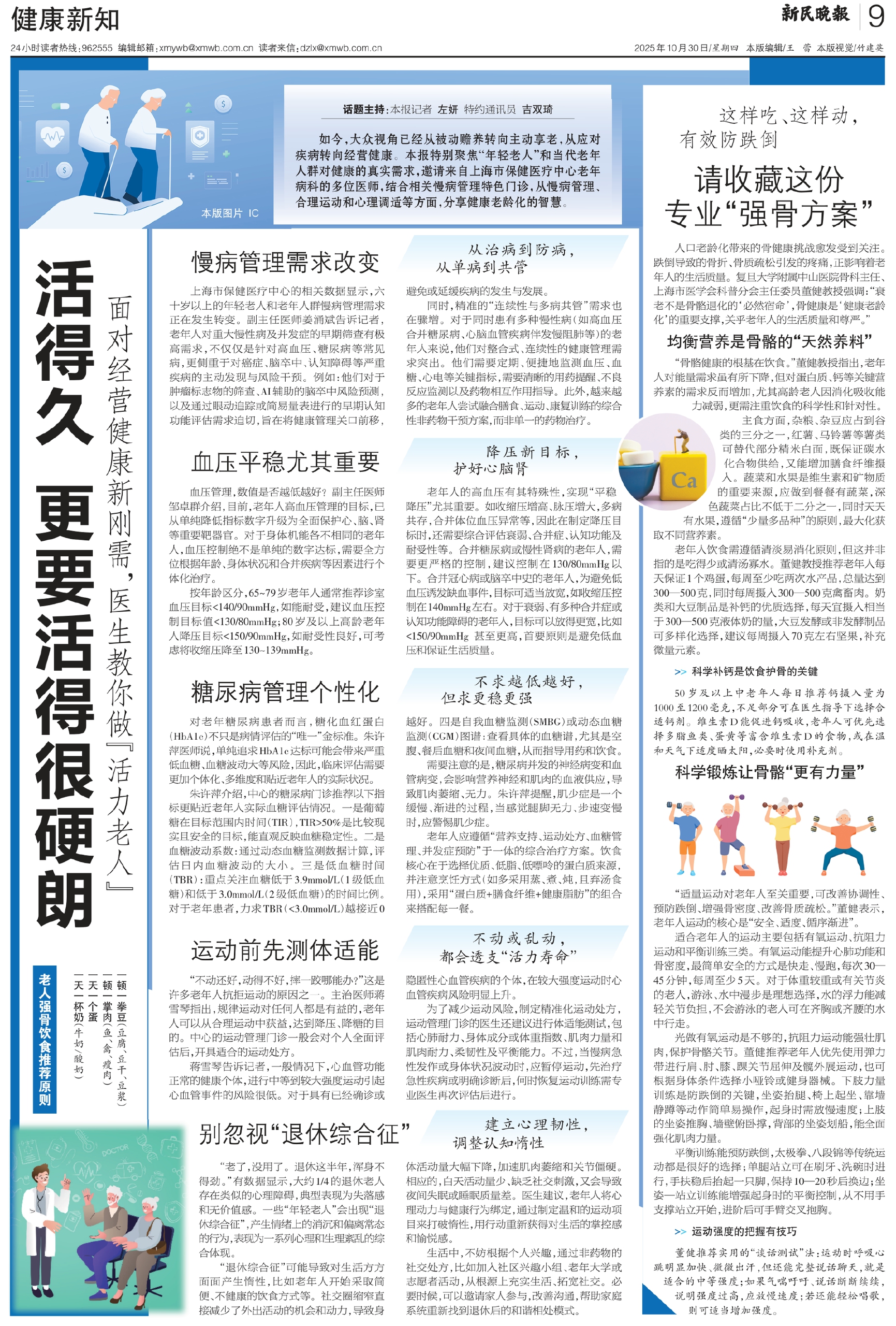 如今,大众视角已经从被动赡养转向主动享老,从应对疾病转向经营健康。本报特别聚焦“年轻老人”和当代老年人群对健康的真实需求,邀请来自上海市保健医疗中心老年病科的多位医师,结合相关慢病管理特色门诊,从慢病管理、合理运动和心理调适等方面,分享健康老龄化的智慧。