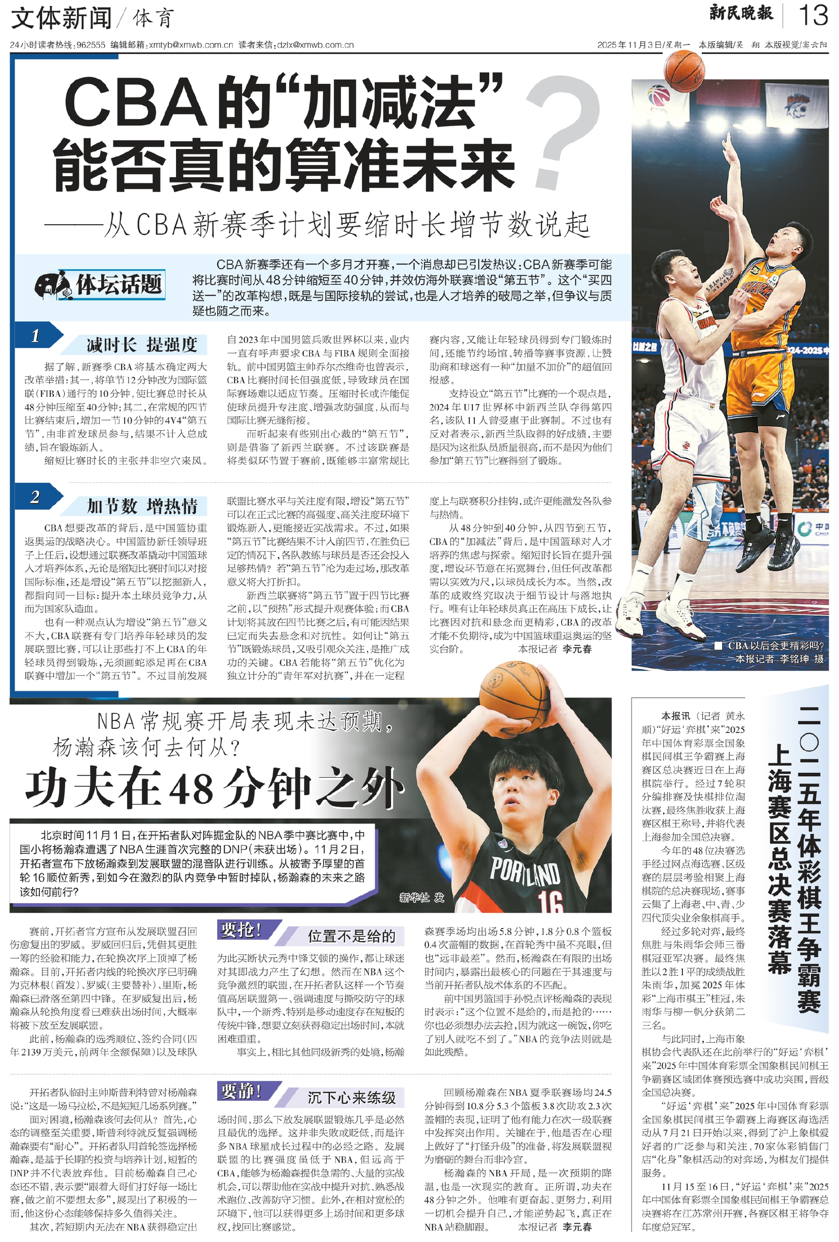 从48分钟到40分钟,从四节到五节,CBA的“加减法”背后,是中国篮球对人才培养的焦虑与探索。缩短时长旨在提升强度,增设环节意在拓宽舞台,但任何改革都需以实效为尺,以球员成长为本。当然,改革的成败终究取决于细节设计与落地执行。唯有让年轻球员真正在高压下成长,让比赛因对抗和悬念而更精彩,CBA的改革才能不负期待,成为中国篮球重返奥运的坚实台阶。 本报记者 李元春