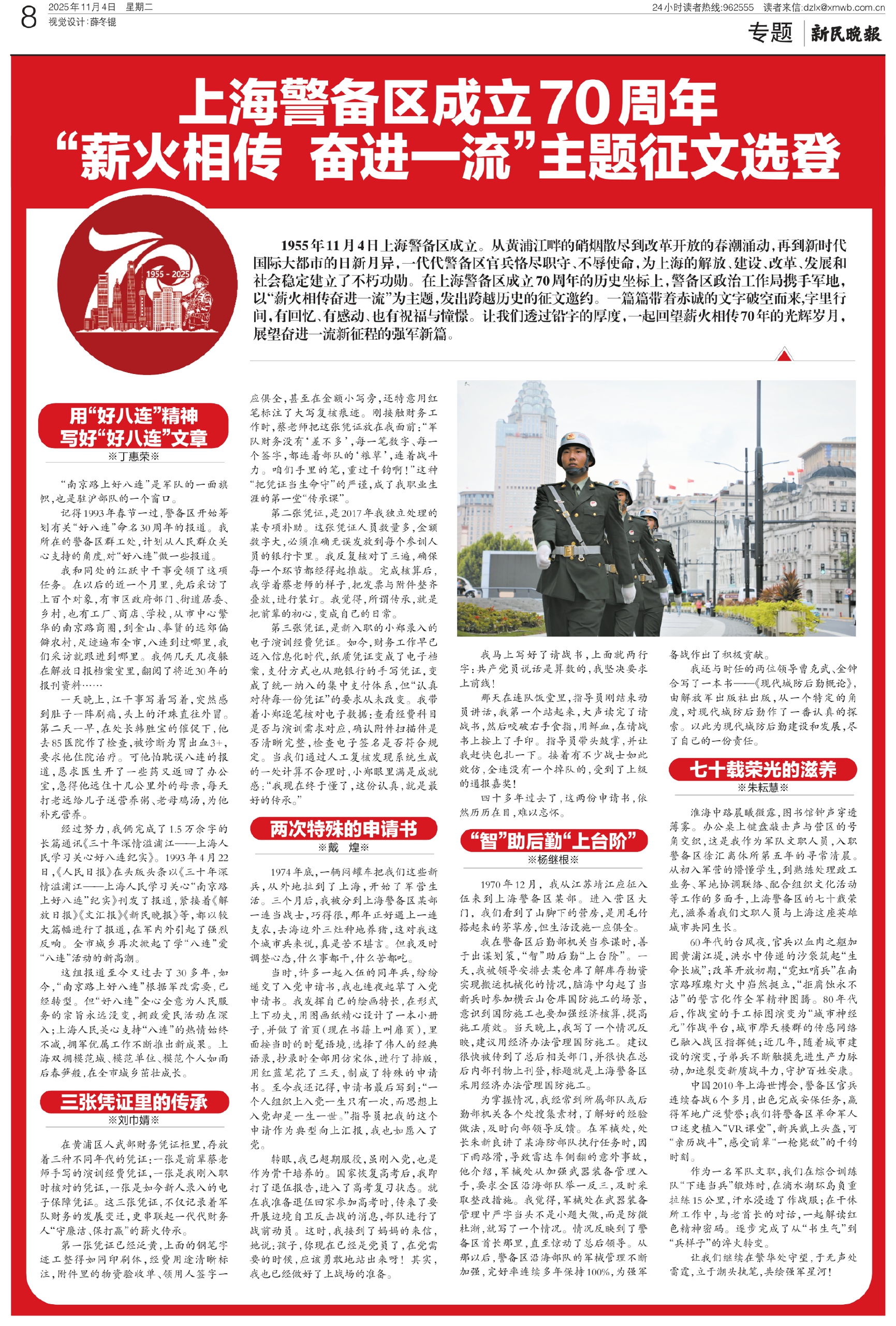 1955年11月4日上海警备区成立。从黄浦江畔的硝烟散尽到改革开放的春潮涌动,再到新时代国际大都市的日新月异,一代代警备区官兵恪尽职守、不辱使命,为上海的解放、建设、改革、发展和社会稳定建立了不朽功勋。在上海警备区成立70周年的历史坐标上,警备区政治工作局携手军地,以“薪火相传奋进一流”为主题,发出跨越历史的征文邀约。一篇篇带着赤诚的文字破空而来,字里行间,有回忆、有感动、也有祝福与憧憬。让我们透过铅字的厚度,一起回望薪火相传70年的光辉岁月,展望奋进一流新征程的强军新篇。