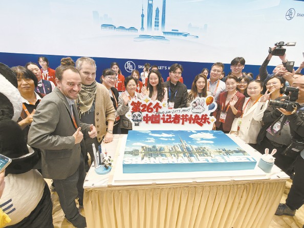 今天是第二十六个中国记者节,参与八届进博会报道工作的“全勤记者”和在上海媒体工作的外籍记者,在进博会新闻中心同享庆祝的蛋糕 本报记者 刘歆 摄