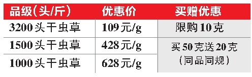 新民健康会员服务中心在售虫草,全部散称的方式,现场任挑任选,虫体金黄饱满,干度达到95%以上。草农直供,品质保证,最低109元/克的虫草,其它规格买多送多,假一赔十!欢迎到店验货!
