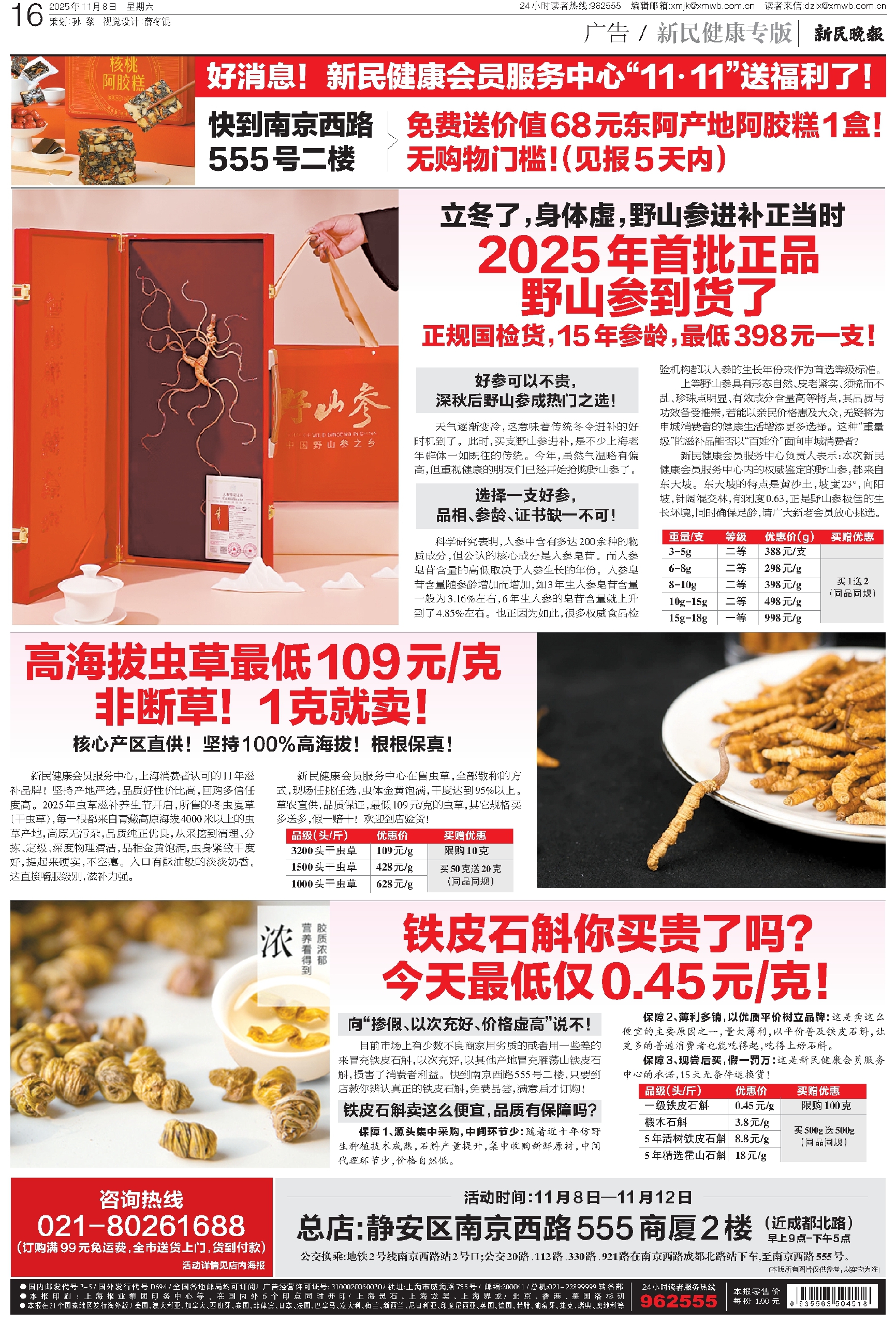 新民健康会员服务中心,上海消费者认可的11年滋补品牌!坚持产地严选,品质好性价比高,回购多信任度高。2025年虫草滋补养生节开启,所售的冬虫夏草(干虫草),每一根都来自青藏高原海拔4000米以上的虫草产地,高原无污杂,品质纯正优良,从采挖到清理、分拣、定级、深度物理清洁,品相金黄饱满,虫身紧致干度好,提起来硬实,不空瘪。入口有酥油般的淡淡奶香。达直接嚼服级别,滋补力强。
