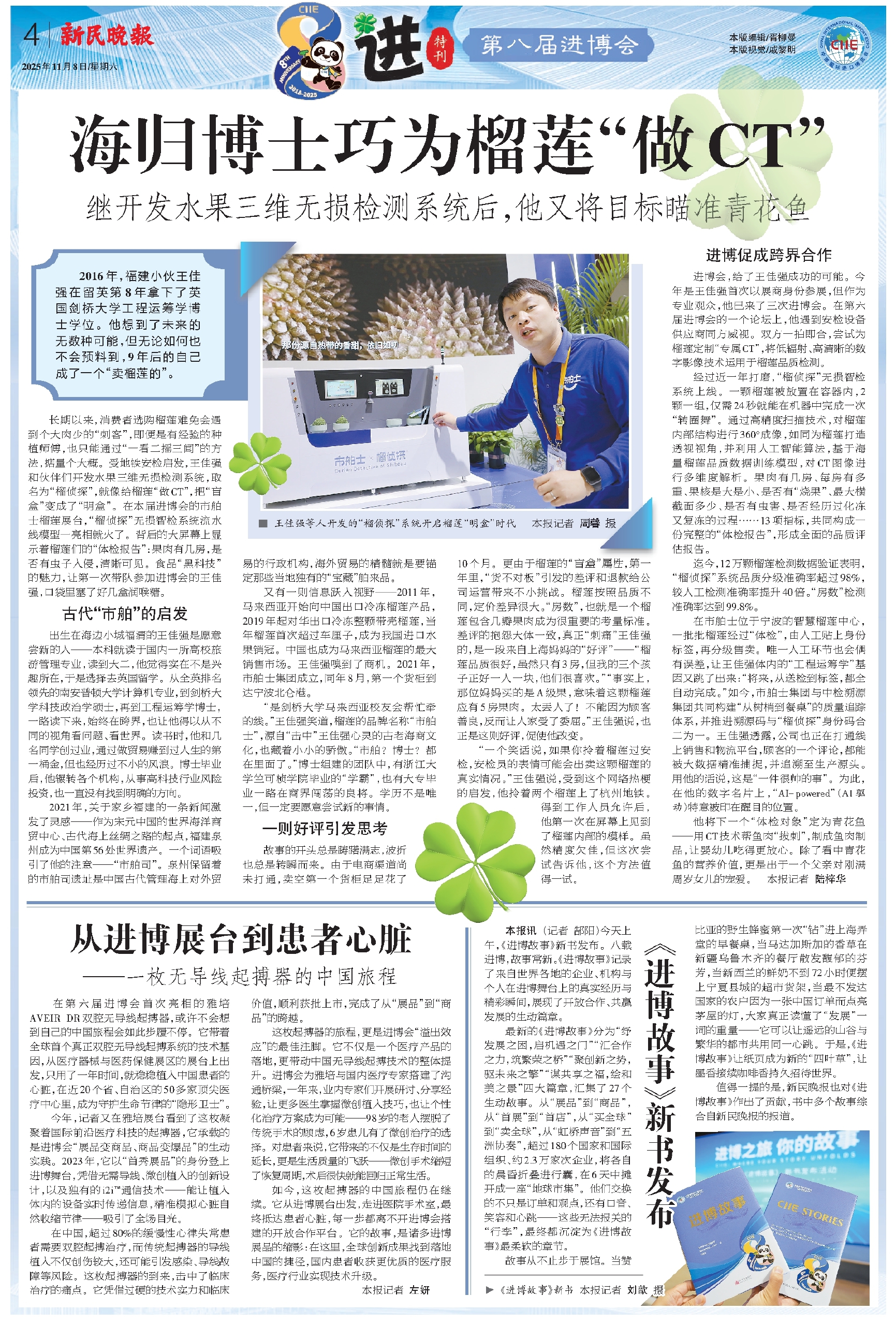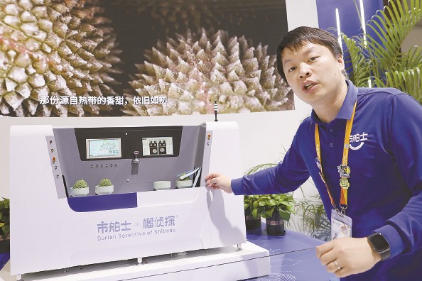 长期以来,消费者选购榴莲难免会遇到个大肉少的“刺客”,即便是有经验的种植师傅,也只能通过“一看二摇三闻”的方法,掂量个大概。受地铁安检启发,王佳强和伙伴们开发水果三维无损检测系统,取名为“榴侦探”,就像给榴莲“做CT”,把“盲盒”变成了“明盒”。在本届进博会的市舶士榴莲展台,“榴侦探”无损智检系统流水线模型一亮相就火了。背后的大屏幕上显示着榴莲们的“体检报告”:果肉有几房,是否有虫子入侵,清晰可见。食品“黑科技”的魅力,让第一次带队参加进博会的王佳强,口袋里塞了好几盒润喉糖。