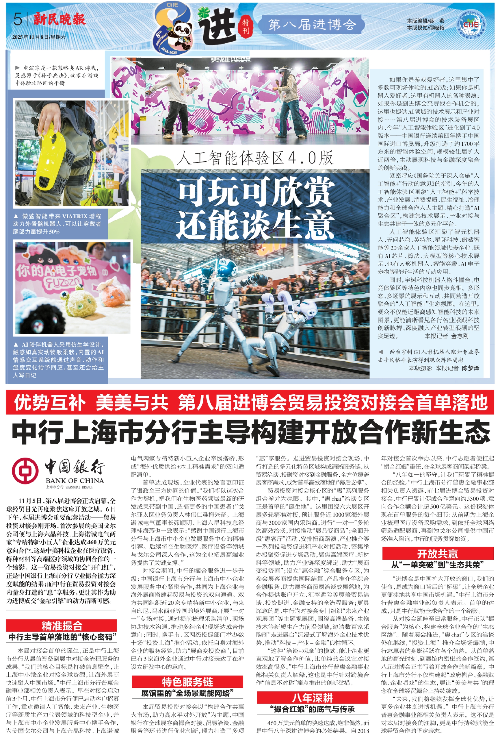 如果你是游戏爱好者,这里集中了多款可现场体验的AI游戏;如果你是机器人爱好者,这里有机器人的各种表演;如果你是到进博会来寻找合作机会的,这里也提供AI领域的技术展示和产业对接……第八届进博会的技术装备展区内,今年“人工智能体验区”进化到了4.0版本——中国银行连续第四年携手中国国际进口博览局,升级打造了约1700平方米的智能体验空间,规模较往届扩大近两倍,生动展现科技与金融深度融合的创新实践。