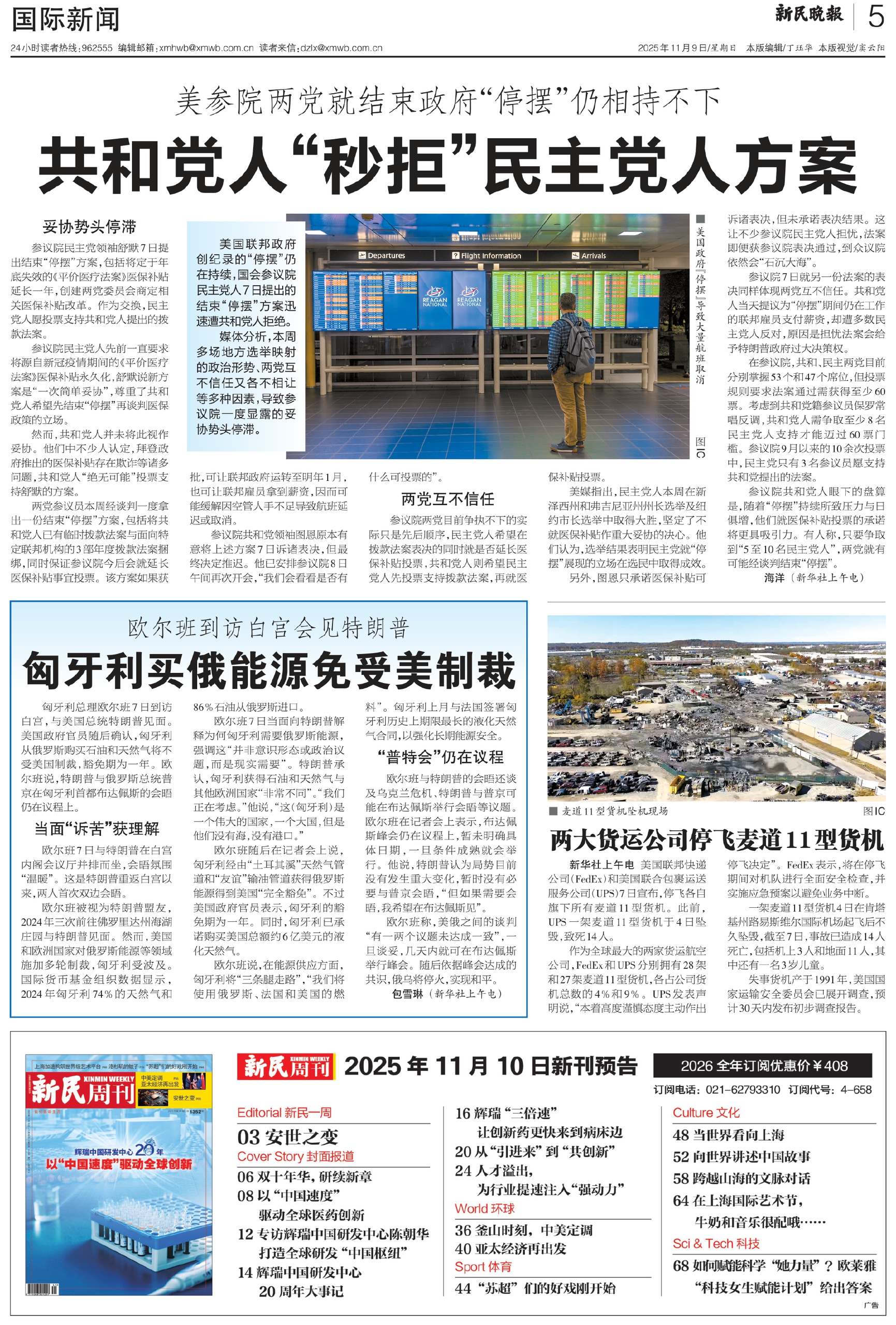 两党参议员本周经谈判一度拿出一份结束“停摆”方案,包括将共和党人已有临时拨款法案与面向特定联邦机构的3部年度拨款法案捆绑,同时保证参议院今后会就延长医保补贴事宜投票。该方案如果获批,可让联邦政府运转至明年1月,也可让联邦雇员拿到薪资,因而可能缓解因空管人手不足导致航班延迟或取消。