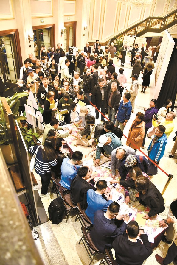 评弹《菜肉馄饨》首演现场演员们为观众签名