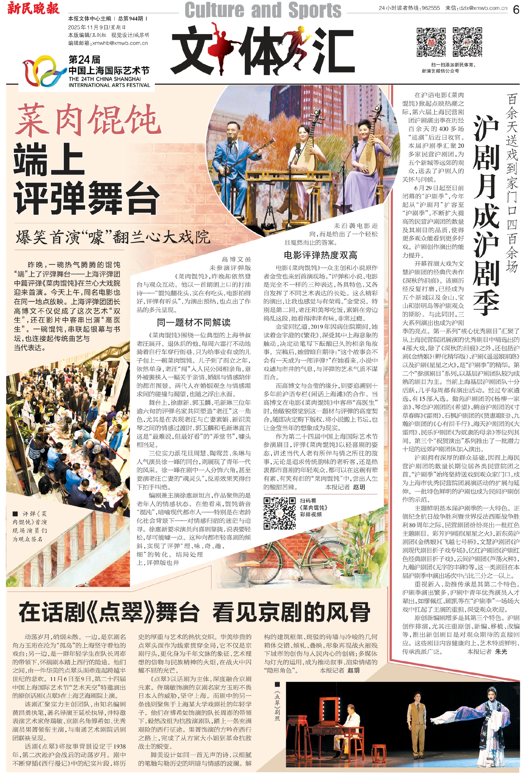 作为第二十四届中国上海国际艺术节参演剧目,评弹《菜肉馄饨》以轻喜剧的姿态,讲述当代人老有所伴与情之所往的故事,无论是追求传统韵味的老听客,还是热衷都市喜剧的年轻观众,都可以在这碗有荤有素、有笑有泪的“菜肉馄饨”中,尝出人生的酸甜苦辣。 本报记者 赵玥