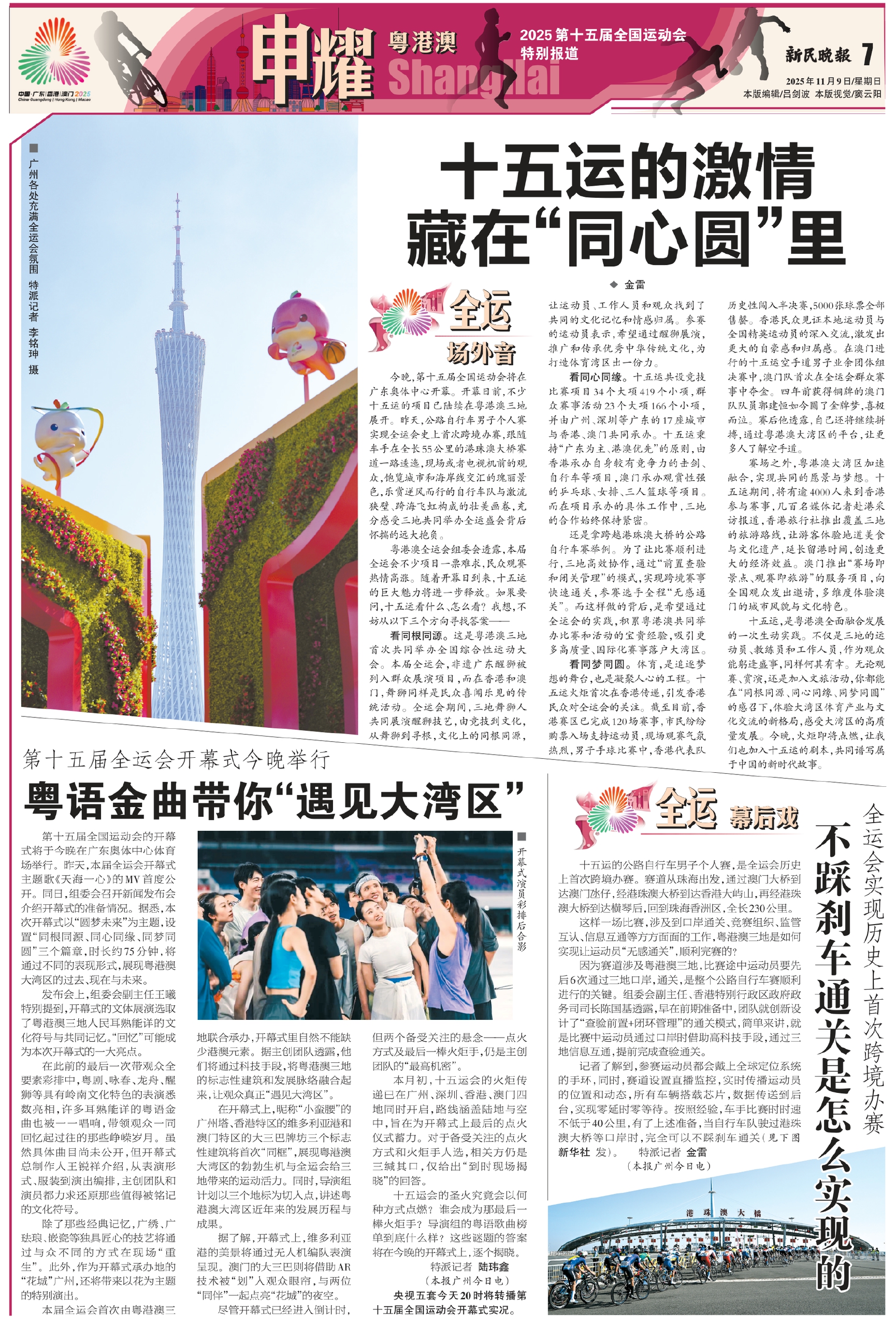 今晚,第十五届全国运动会将在广东奥体中心开幕。开幕日前,不少十五运的项目已陆续在粤港澳三地展开。昨天,公路自行车男子个人赛实现全运会史上首次跨境办赛,跟随车手在全长55公里的港珠澳大桥赛道一路逶迤,现场或者电视机前的观众,饱览城市和海岸线交汇的瑰丽景色,乐赏逆风而行的自行车队与激流狭壁、跨海飞虹构成的壮美画卷,充分感受三地共同举办全运盛会背后怀揣的远大抱负。