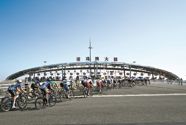 记者了解到,参赛运动员都会戴上全球定位系统的手环,同时,赛道设置直播监控,实时传播运动员的位置和动态,所有车辆搭载芯片,数据传送到后台,实现零延时零等待。按照经验,车手比赛时时速不低于40公里,有了上述准备,当自行车队驶过港珠澳大桥等口岸时,完全可以不踩刹车通关(见下图新华社 发)。 特派记者 金雷