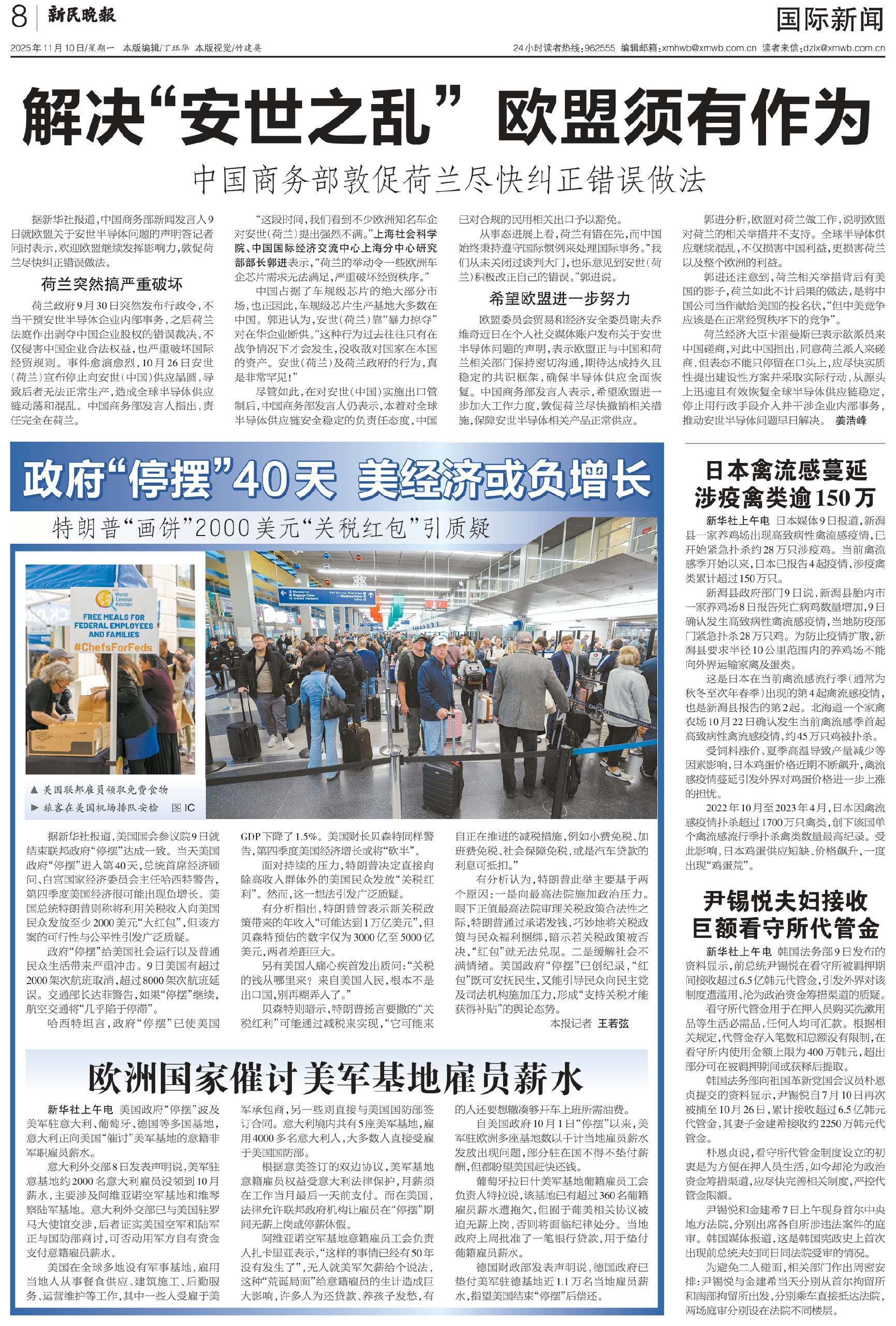 据新华社报道,美国国会参议院9日就结束联邦政府“停摆”达成一致。当天美国政府“停摆”进入第40天,总统首席经济顾问、白宫国家经济委员会主任哈西特警告,第四季度美国经济很可能出现负增长。美国总统特朗普则称将利用关税收入向美国民众发放至少2000美元“大红包”,但该方案的可行性与公平性引发广泛质疑。