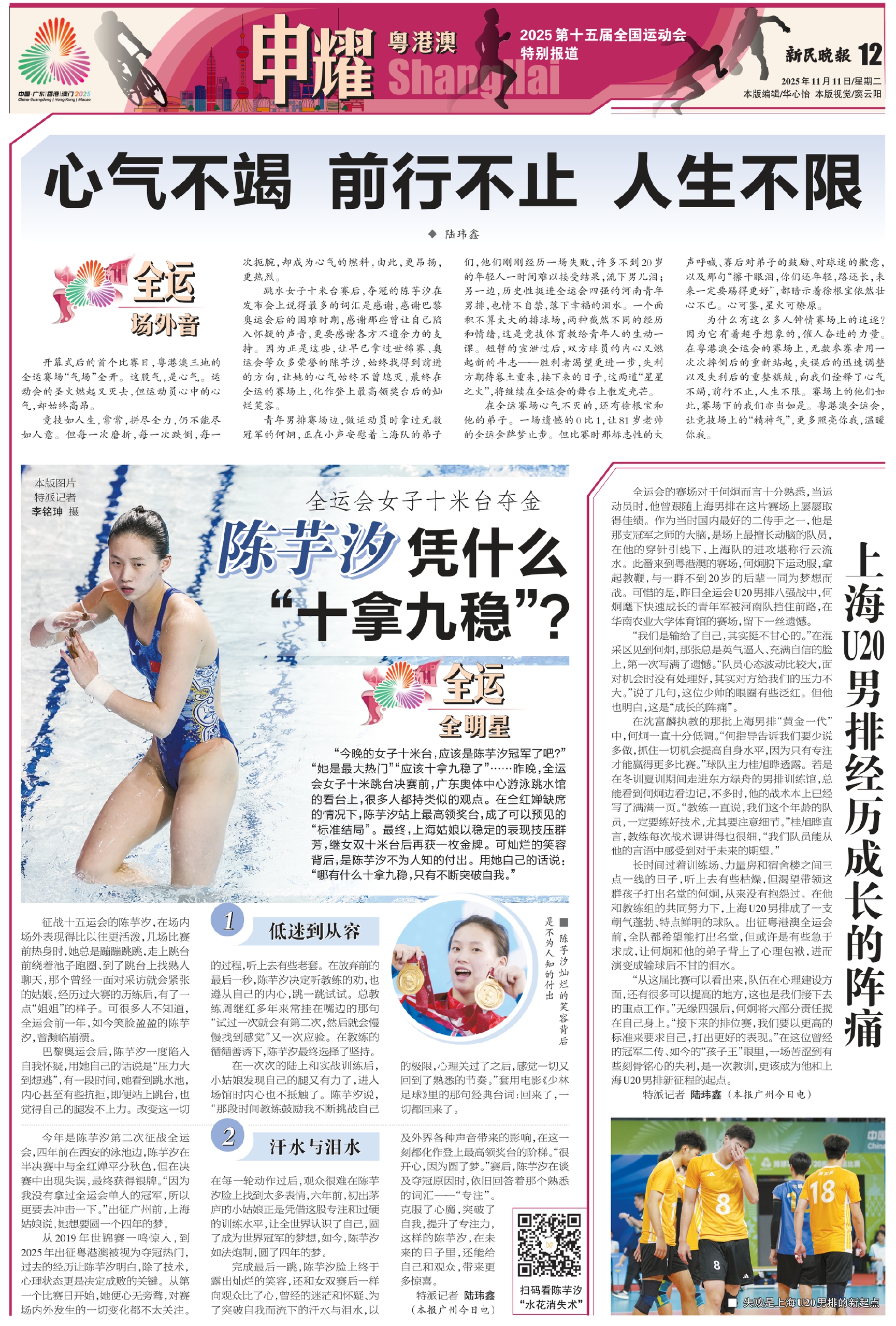 青年男排赛场边,做运动员时拿过无数冠军的何炯,正在小声安慰着上海队的弟子们,他们刚刚经历一场失败,许多不到20岁的年轻人一时间难以接受结果,流下男儿泪;另一边,历史性挺进全运会四强的河南青年男排,也情不自禁,落下幸福的泪水。一个面积不算太大的排球场,两种截然不同的经历和情绪,这是竞技体育教给青年人的生动一课。短暂的宣泄过后,双方球员的内心又燃起新的斗志——胜利者渴望更进一步,失利方期待卷土重来,接下来的日子,这两道“星星之火”,将继续在全运会的舞台上散发光芒。