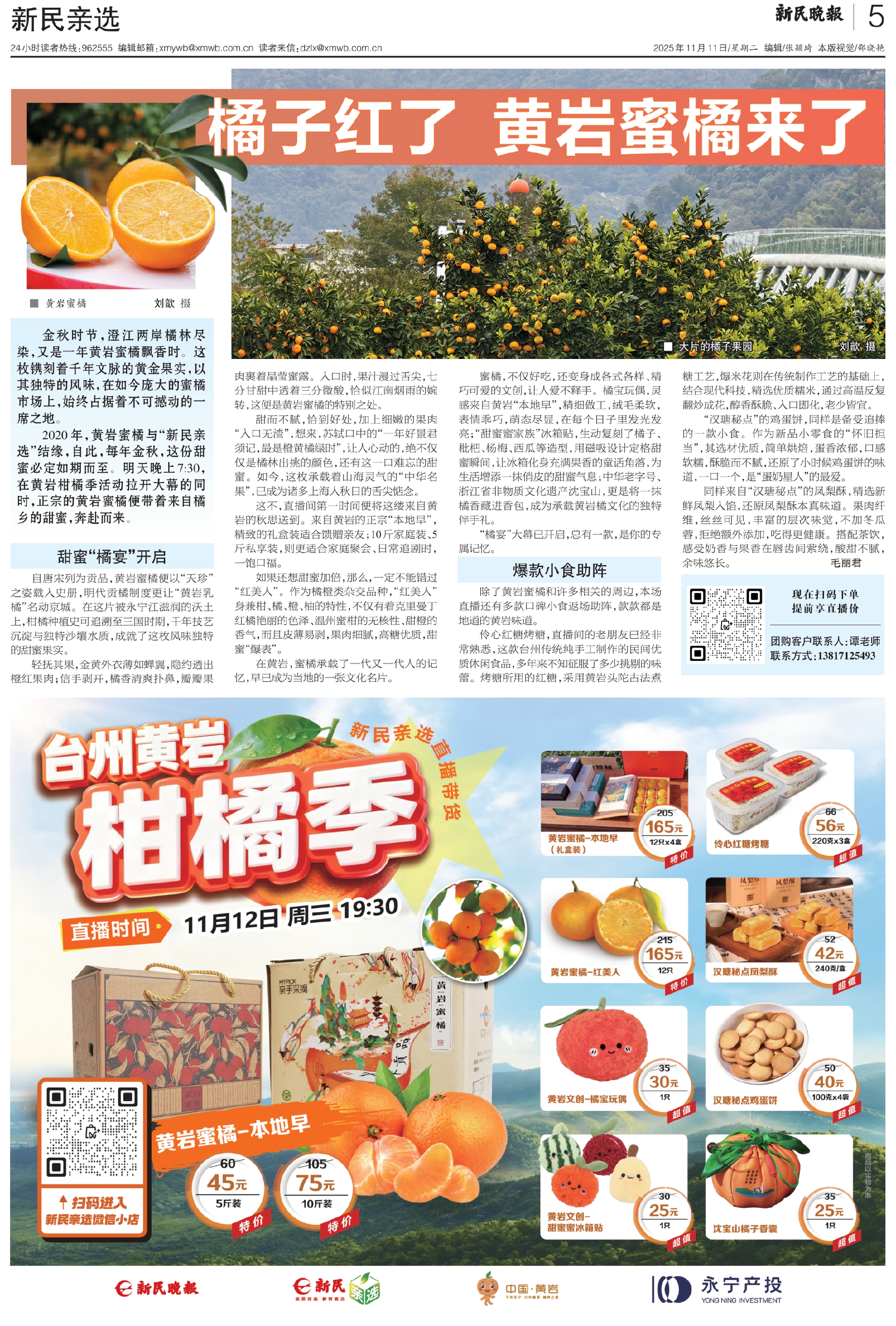 2020年,黄岩蜜橘与“新民亲选”结缘,自此,每年金秋,这份甜蜜必定如期而至。明天晚上7:30,在黄岩柑橘季活动拉开大幕的同时,正宗的黄岩蜜橘便带着来自橘乡的甜蜜,奔赴而来。