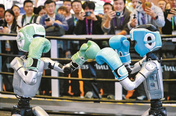 在第八届进博会宇树科技展台,人形机器人进行格斗表演 新华社 发