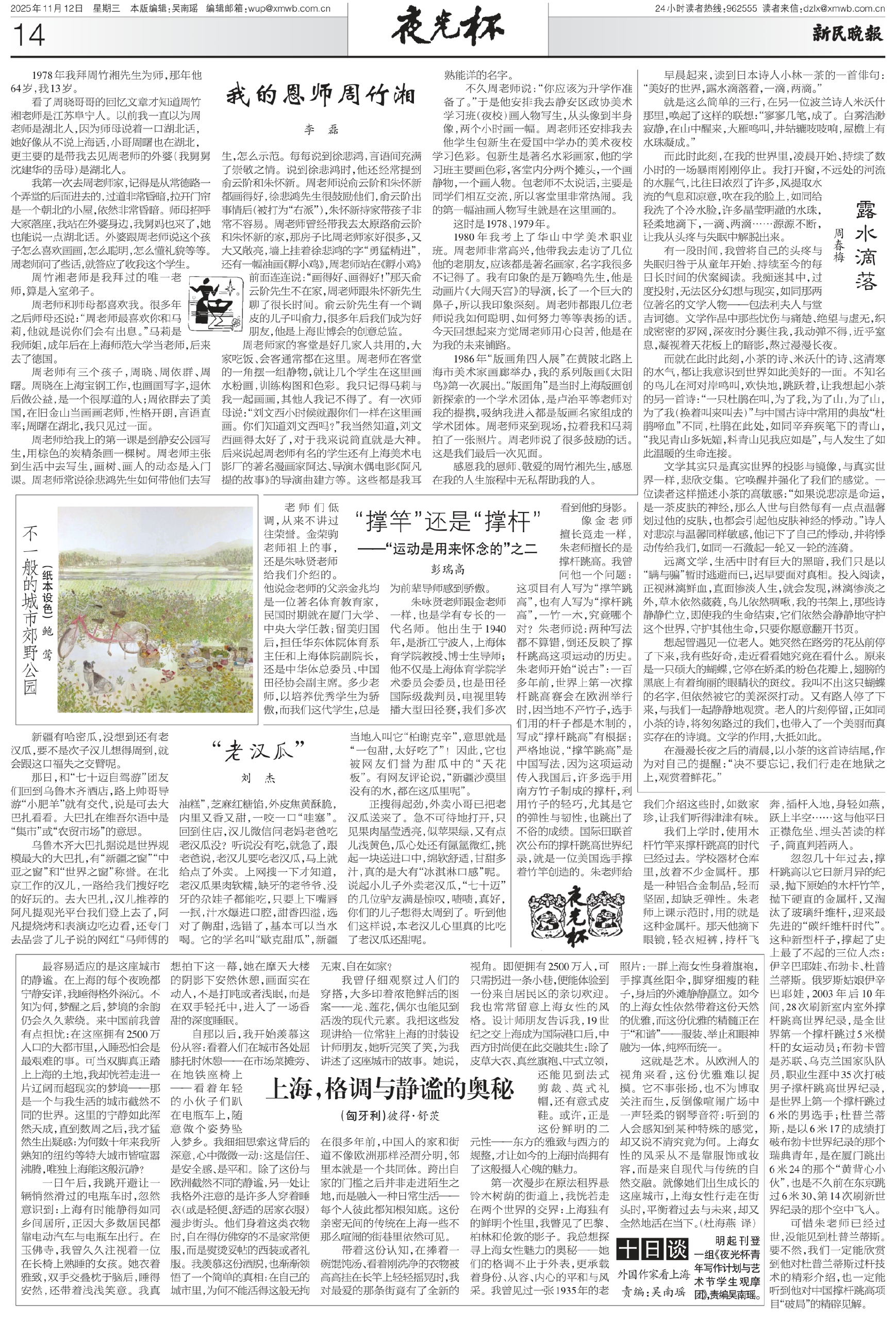 周老师给我上的第一课是到静安公园写生,用棕色的炭精条画一棵树。周老师主张到生活中去写生,画树、画人的动态是入门课。周老师常说徐悲鸿先生如何带他们去写生,怎么示范。每每说到徐悲鸿,言语间充满了崇敬之情。说到徐悲鸿时,他还经常提到俞云阶和朱怀新。周老师说俞云阶和朱怀新都画得好,徐悲鸿先生很鼓励他们,俞云阶出事情后(被打为“右派”),朱怀新持家带孩子非常不容易。周老师曾经带我去太原路俞云阶和朱怀新的家,那房子比周老师家好很多,又大又敞亮,墙上挂着徐悲鸿的字“勇猛精进”,还有一幅油画《孵小鸡》,周老师站在《孵小鸡》前面连连说:“画得好、画得好!”那天俞云阶先生不在家,周老师跟朱怀新先生聊了很长时间。俞云阶先生有一个调皮的儿子叫俞力,很多年后我们成为好朋友,他是上海世博会的创意总监。