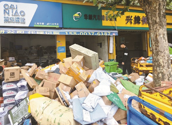 今天上午,杨高路德平路口的一家菜鸟驿站门口,“双11”包裹堆积如山 本报记者 徐程 摄