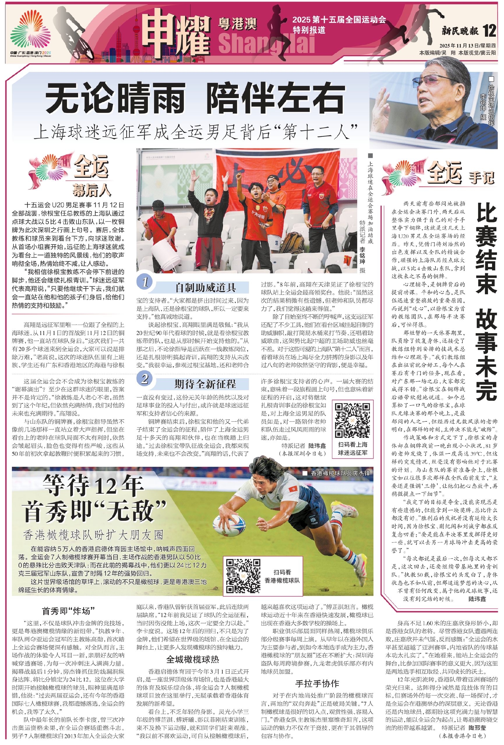 十五运会U20男足赛事11月12日全部战罢,徐根宝任总教练的上海队通过点球大战以5比4击败山东队,以一枚铜牌为此次深圳之行画上句号。赛后,全体教练和球员来到看台下方,向球迷致谢。从首场小组赛开始,远征的上海球迷就成为看台上一道独特的风景线,他们的歌声响彻全场,热情始终不减,让人感动。
