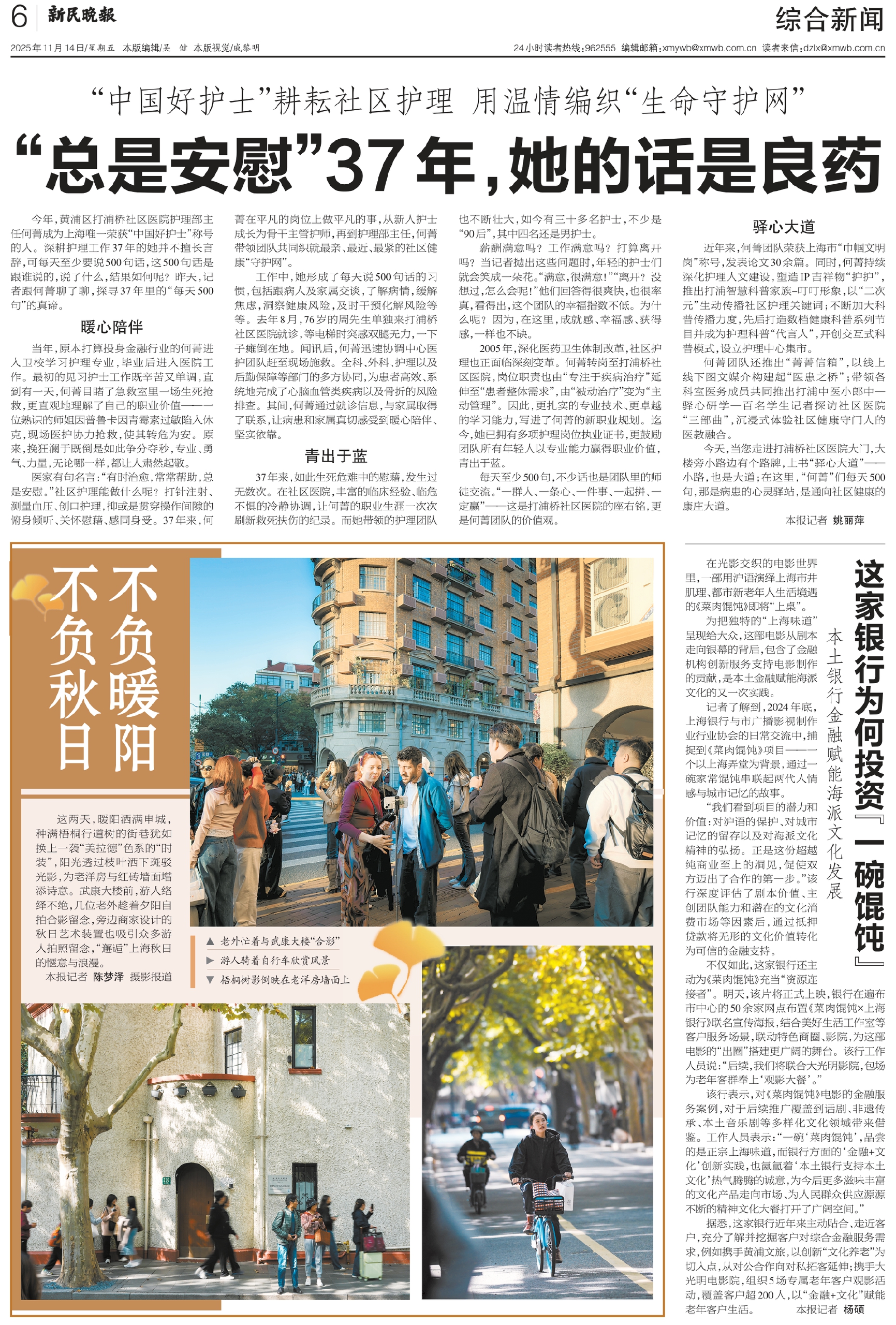 医家有句名言:“有时治愈,常常帮助,总是安慰。”社区护理能做什么呢?打针注射、测量血压、创口护理,抑或是贯穿操作间隙的俯身倾听、关怀慰藉、感同身受。37年来,何菁在平凡的岗位上做平凡的事,从新人护士成长为骨干主管护师,再到护理部主任,何菁带领团队共同织就最亲、最近、最紧的社区健康“守护网”。