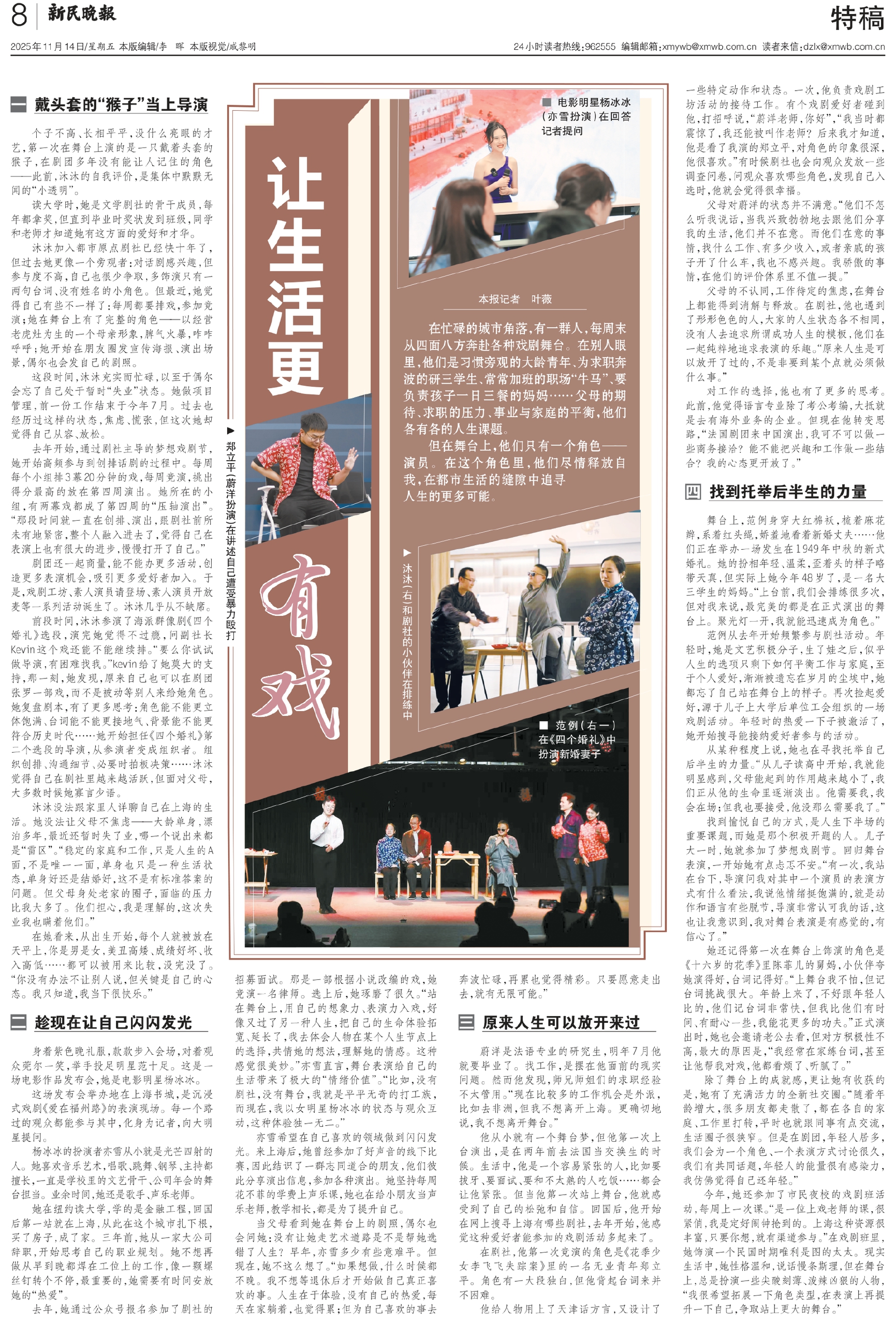 去年,她通过公众号报名参加了剧社的招募面试。那是一部根据小说改编的戏,她竞演一名律师。选上后,她琢磨了很久。“站在舞台上,用自己的想象力、表演力入戏,好像又过了另一种人生,把自己的生命体验拓宽、延长了,我去体会人物在某个人生节点上的选择,共情她的想法,理解她的情感。这种感觉很美妙。”亦雪直言,舞台表演给自己的生活带来了极大的“情绪价值”。“比如,没有剧社,没有舞台,我就是平平无奇的打工族,而现在,我以女明星杨冰冰的状态与观众互动,这种体验独一无二。”