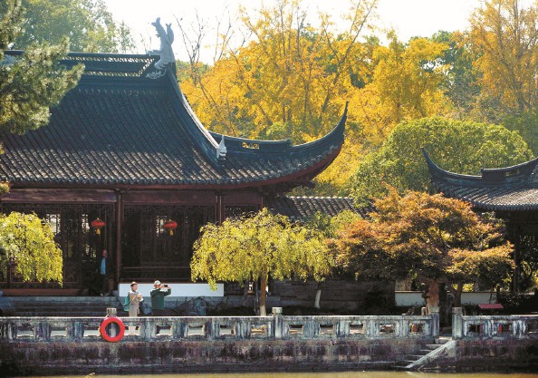随着申城昼夜温差渐渐拉大,银杏、梧桐、无患子、乌桕、红枫等色叶树已悄然变色,缤纷如画。在沪郊青浦的上海大观园里,古色古香的建筑与绚烂的色叶树交相辉映,勾勒出一幅晚秋图画。杨建正 摄影报道