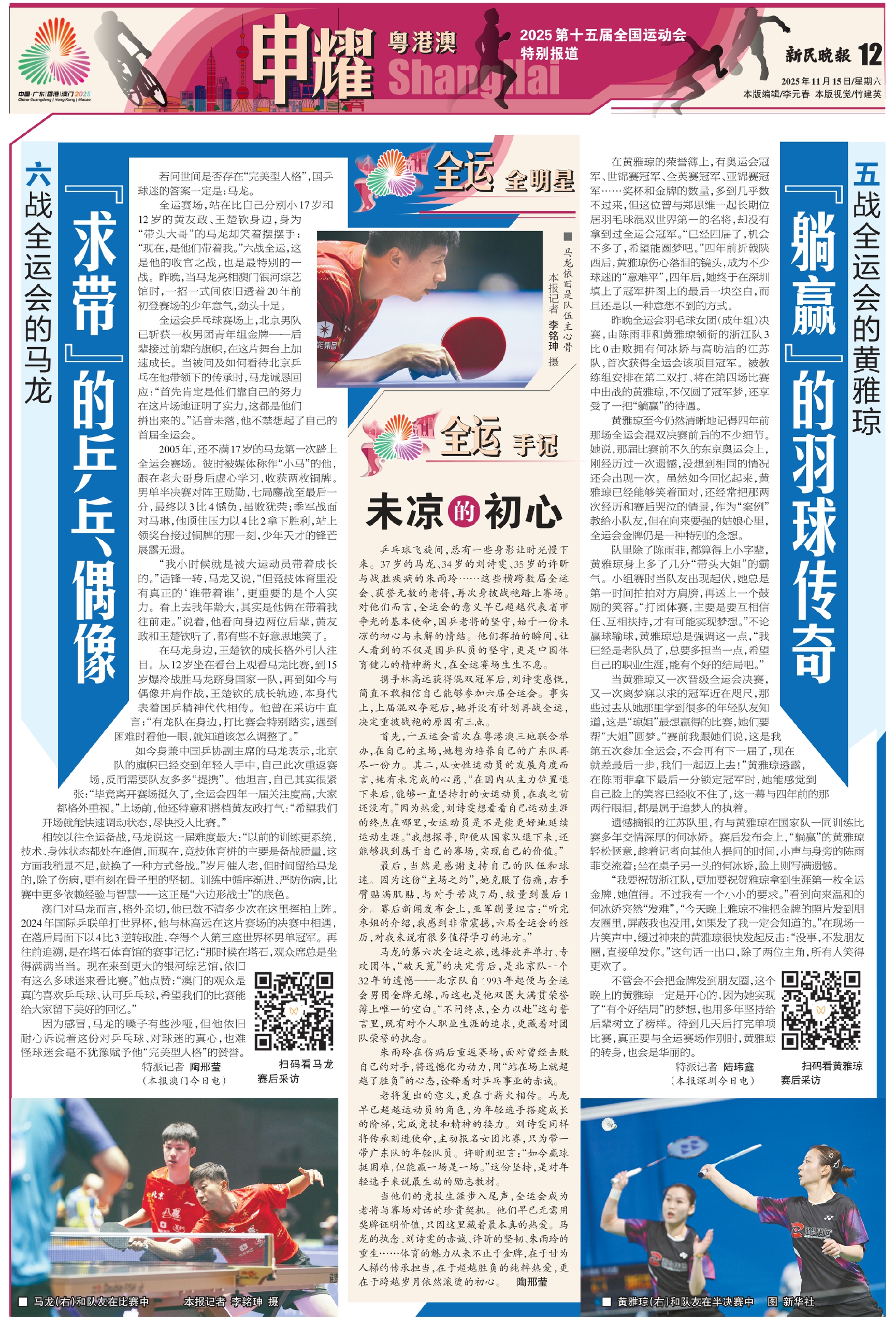 相较以往全运备战,马龙说这一届难度最大:“以前的训练更系统,技术、身体状态都处在峰值,而现在,竞技体育拼的主要是备战质量,这方面我稍显不足,就换了一种方式备战。”岁月催人老,但时间留给马龙的,除了伤病,更有刻在骨子里的坚韧。训练中循序渐进、严防伤病,比赛中更多依赖经验与智慧——这正是“六边形战士”的底色。