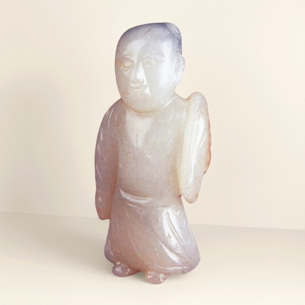 清代青白玉持莲童子高3.8厘米,玉色青中泛白,抛光后更显温润。匠人融合圆雕、浅浮雕与线刻工艺,将童子刻画得形神兼备。他眉眼弯弯、面带笑意,左脚在前、右腿后抬的姿态,搭配长裤上的褶皱纹饰,生动展现出欢快行走的模样。童子双手握持莲蓬梗,长柄呈“L”形弯曲,顶端莲蓬紧贴脑后,仿佛急于回家分享,画面感十足。