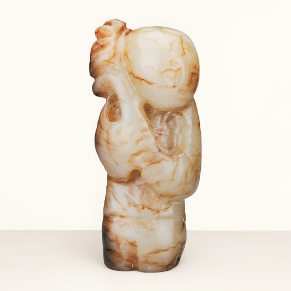 元代青玉持莲童子高4.3厘米,玉色青中泛黄,通体圆雕并局部采用镂雕工艺。童子跪立面向左侧,憨态可掬,双手紧握的荷叶微微卷曲,仿佛因日晒而略显枯萎,细节极具生活气息。这件玉雕比例协调、玉质温润、抛光柔和,延续了吉祥寓意的同时,展现出鲜明的元代风格。与宋代精细雕琢不同,元代工匠多用重刀刻画眉眼口鼻,线条粗重洒脱、不拘小节,形成独有的写意韵味,这也是元代传世持莲童子玉器的典型特征。