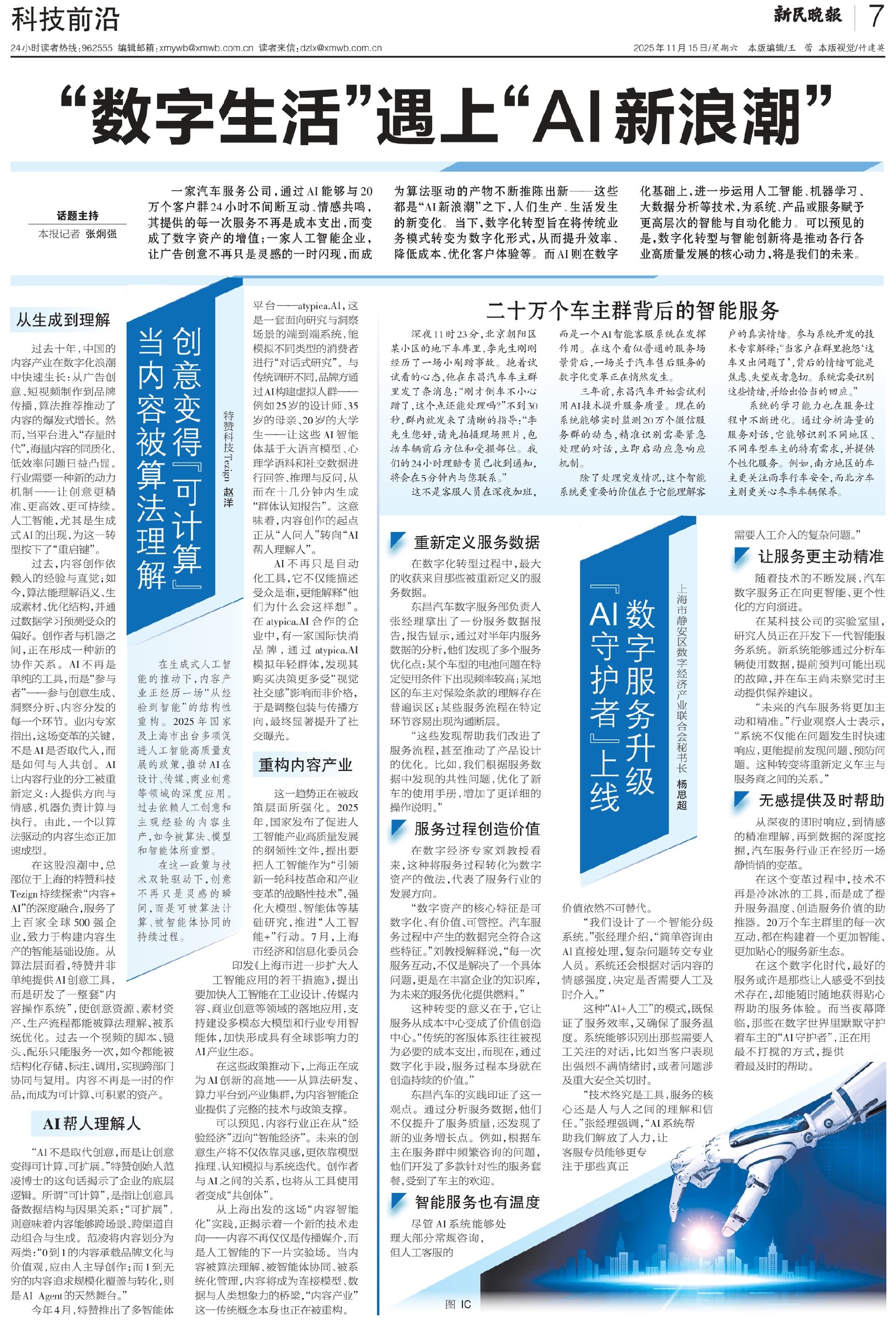 一家汽车服务公司,通过AI能够与20万个客户群24小时不间断互动、情感共鸣,其提供的每一次服务不再是成本支出,而变成了数字资产的增值;一家人工智能企业,让广告创意不再只是灵感的一时闪现,而成为算法驱动的产物不断推陈出新——这些都是“AI新浪潮”之下,人们生产、生活发生的新变化。当下,数字化转型旨在将传统业务模式转变为数字化形式,从而提升效率、降低成本、优化客户体验等。而AI则在数字化基础上,进一步运用人工智能、机器学习、大数据分析等技术,为系统、产品或服务赋予更高层次的智能与自动化能力。可以预见的是,数字化转型与智能创新将是推动各行各业高质量发展的核心动力,将是我们的未来。