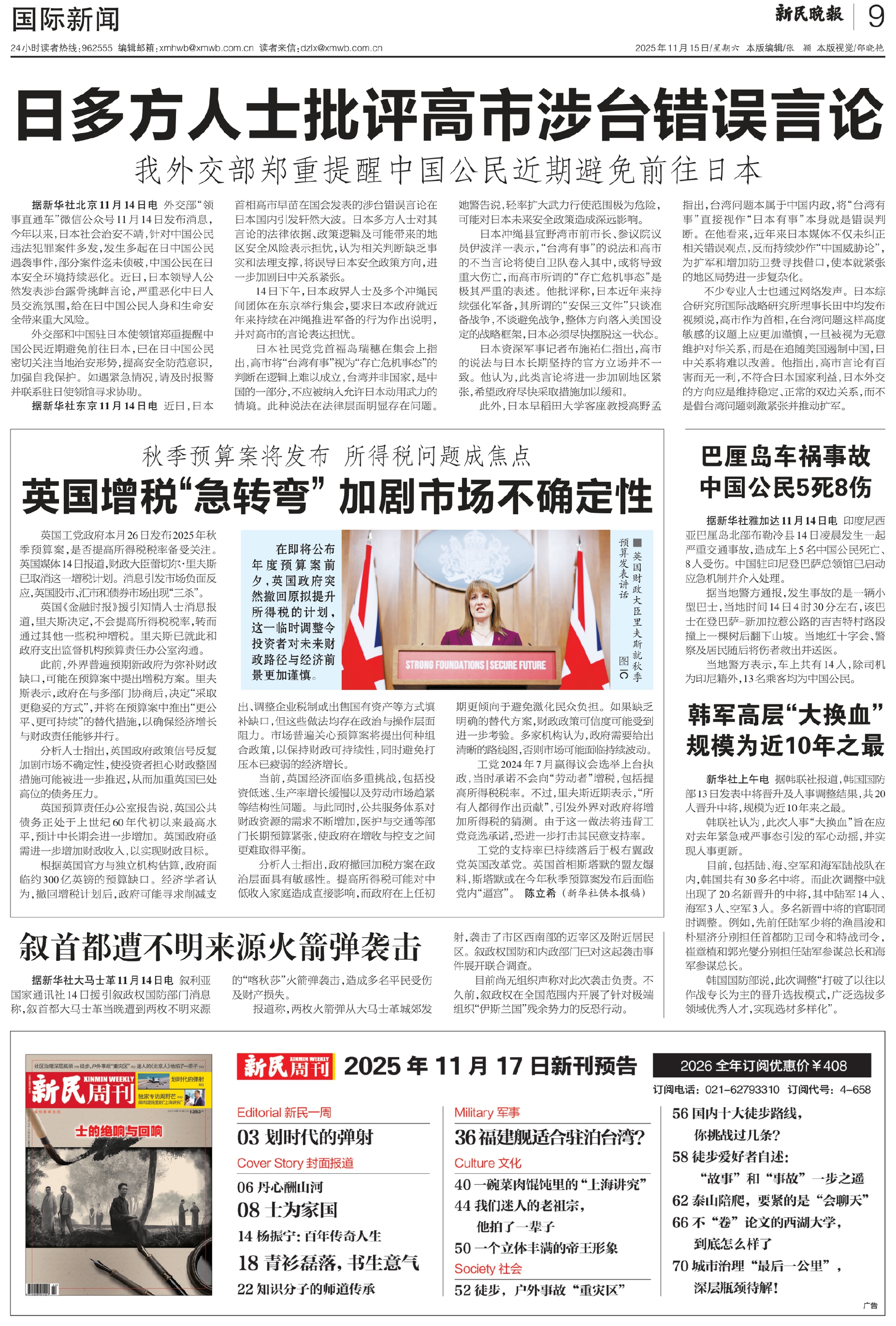 据新华社东京11月14日电 近日,日本首相高市早苗在国会发表的涉台错误言论在日本国内引发轩然大波。日本多方人士对其言论的法律依据、政策逻辑及可能带来的地区安全风险表示担忧,认为相关判断缺乏事实和法理支撑,将误导日本安全政策方向,进一步加剧日中关系紧张。