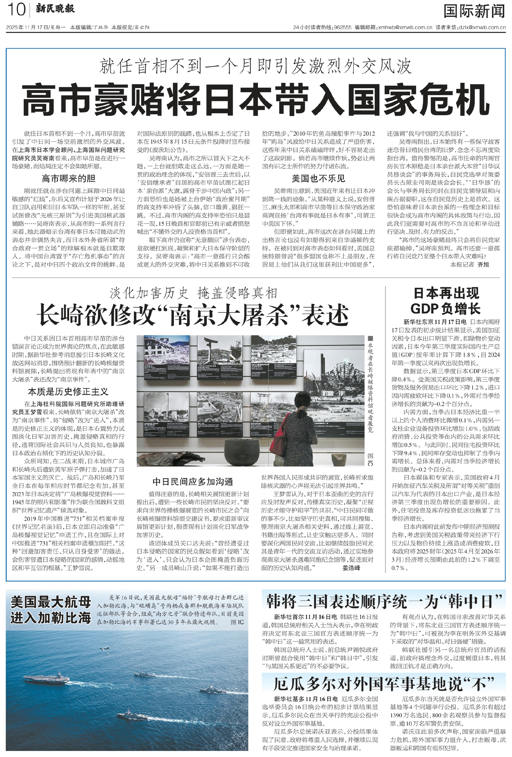 刚就任就在涉台问题上踩踏中日间最敏感的“红线”,尔后又宣布计划于2026年让自卫队启用和旧日本军队一样的军衔,甚至试图修改“无核三原则”为引进美国核武器铺路……吴寄南表示,从高市的一系列言行来看,她此番暗示台湾有事日本可能动武的表态并非偶然失言,而日本外务省所谓“符合政府一贯立场”的辩解根本就是自欺欺人。将中国台湾置于“存亡危机事态”的言论之下,是对中日四个政治文件的挑衅,是对国际法原则的践踏,也从根本上否定了日本在1945年8月15日无条件投降时宣布接受的《波茨坦公告》。