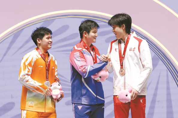但失利并没有打倒王楚钦,就如同当年樊振东追赶着马龙的脚步,他和林诗栋也在追赶樊振东(见右上图 三人在领奖台上)。在全运会的赛场,我们看到了国乒的传承。