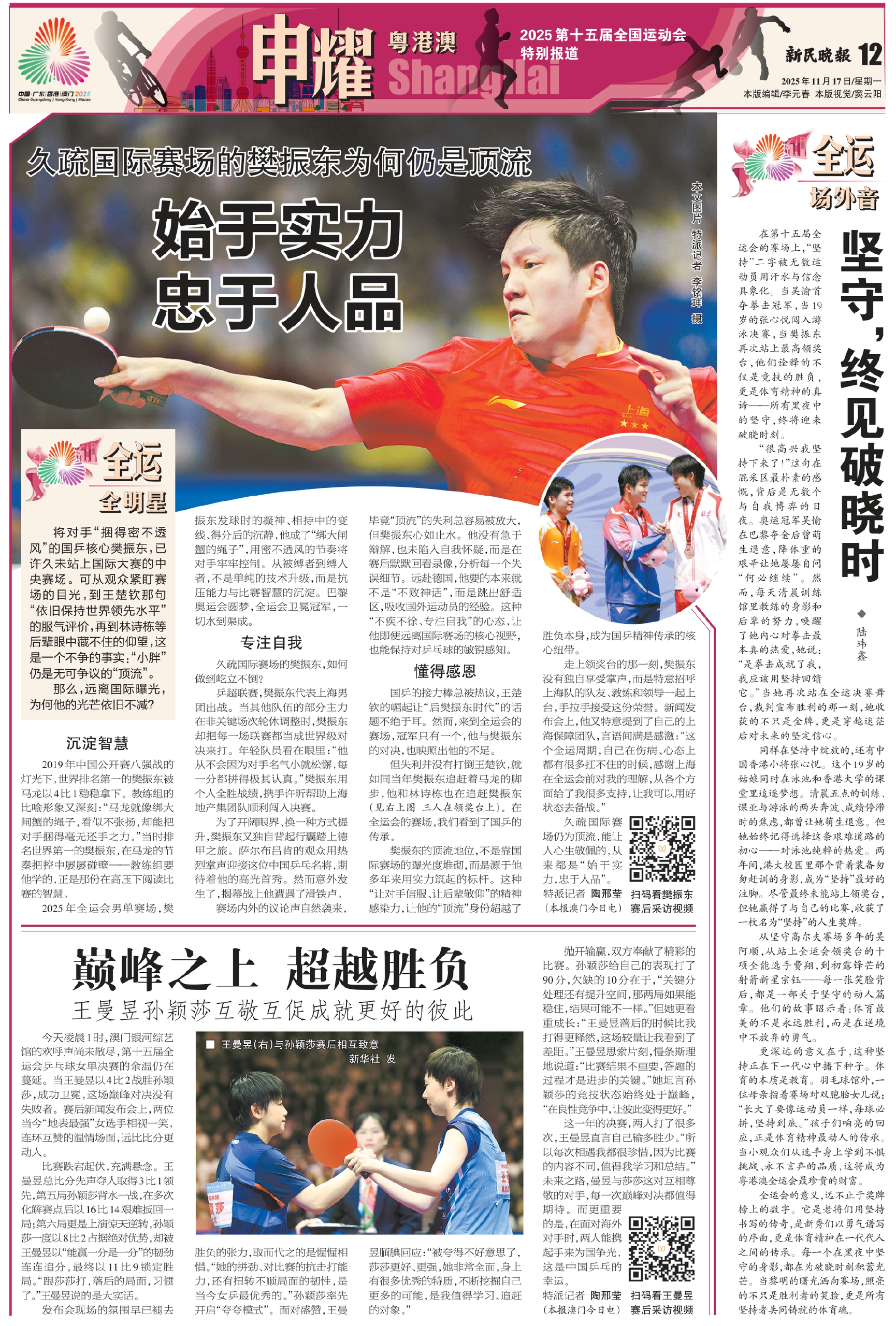 走上领奖台的那一刻,樊振东没有独自享受掌声,而是特意招呼上海队的队友、教练和领导一起上台,手拉手接受这份荣誉。新闻发布会上,他又特意提到了自己的上海保障团队,言语间满是感激:“这个全运周期,自己在伤病、心态上都有很多扛不住的时候,感谢上海在全运会前对我的理解,从各个方面给了我很多支持,让我可以用好状态去备战。”