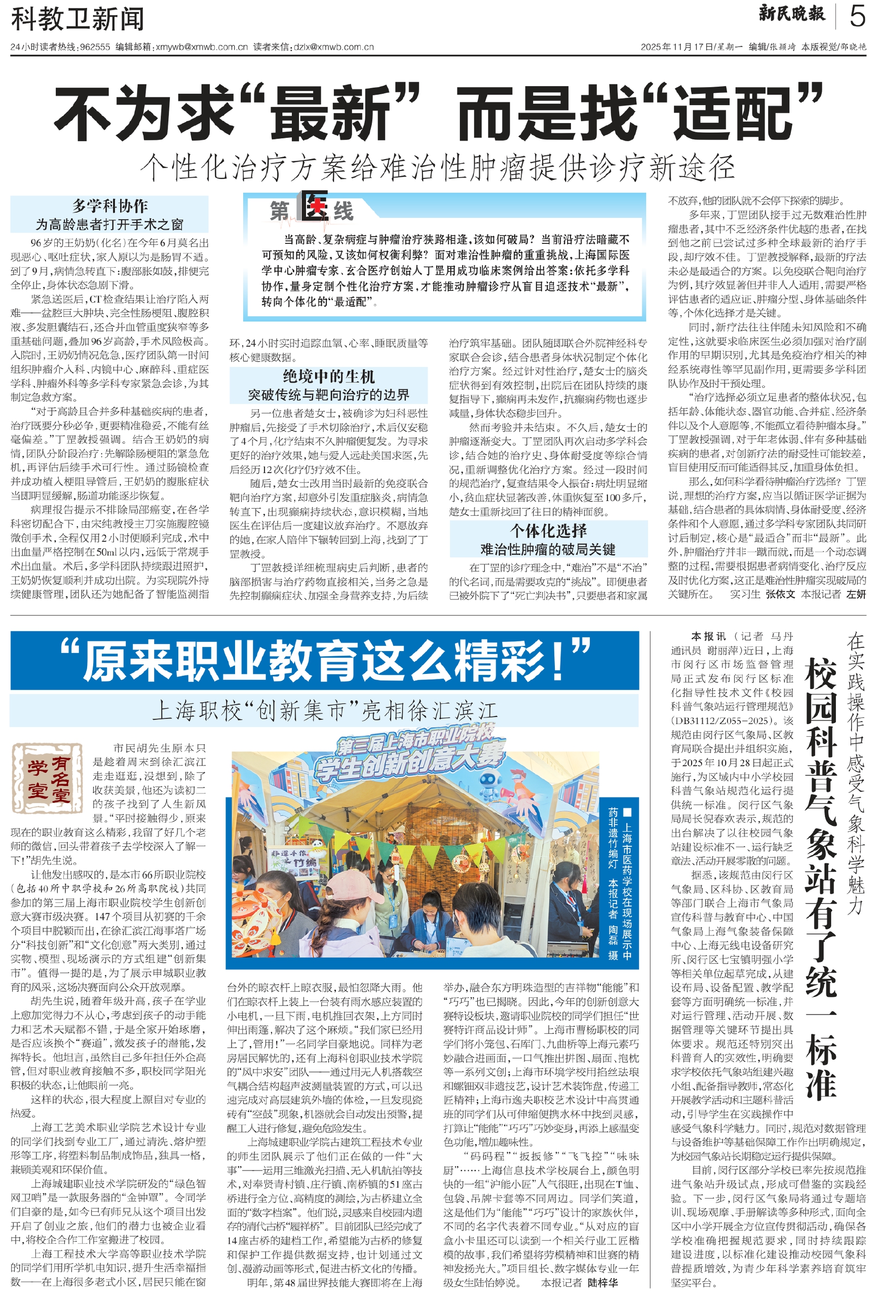 那么,如何科学看待肿瘤治疗选择?丁罡说,理想的治疗方案,应当以循证医学证据为基础,结合患者的具体病情、身体耐受度、经济条件和个人意愿,通过多学科专家团队共同研讨后制定,核心是“最适合”而非“最新”。此外,肿瘤治疗并非一蹴而就,而是一个动态调整的过程,需要根据患者病情变化、治疗反应及时优化方案,这正是难治性肿瘤实现破局的关键所在。 实习生 张依文 本报记者 左妍
