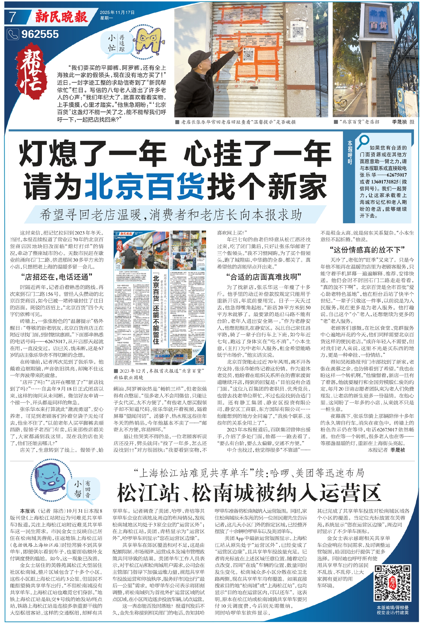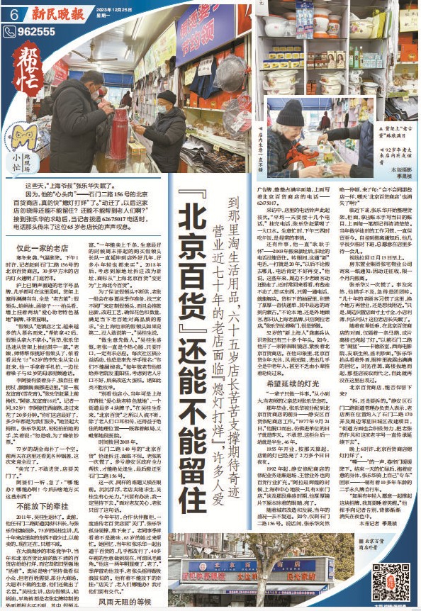 这封来信,把记忆拉回到2023年冬天。当时,本报连续报道了营业近70年的北京百货商店因地块旧改面临“熄灯打烊”的情况,牵动了整座城市的心。无数市民赶在歇业前涌向石门二路,挤进那间30多平方米的小店,只想把老上海的温暖多留一会儿。