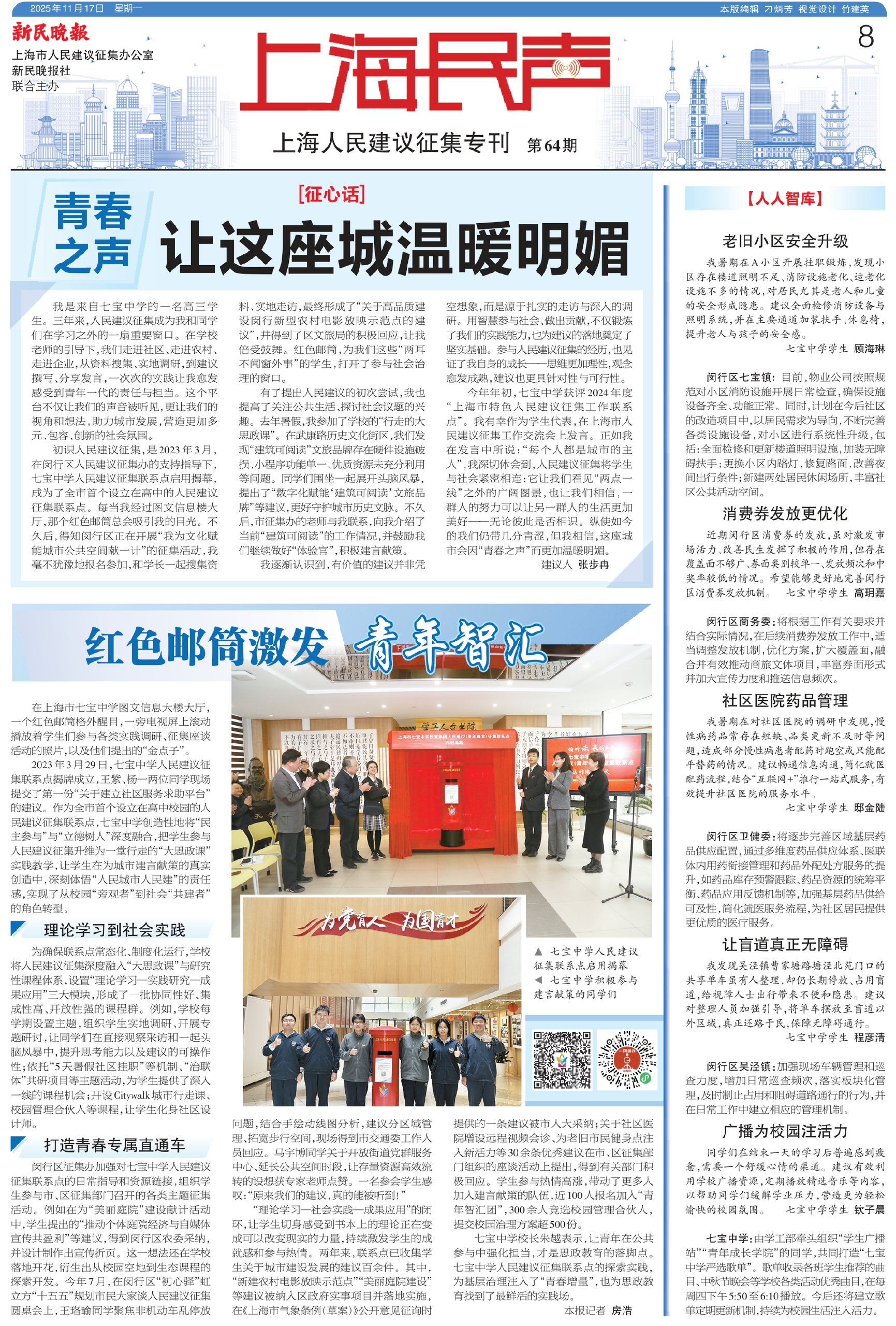 今年年初,七宝中学获评2024年度“上海市特色人民建议征集工作联系点”。我有幸作为学生代表,在上海市人民建议征集工作交流会上发言。正如我在发言中所说:“每个人都是城市的主人”,我深切体会到,人民建议征集将学生与社会紧密相连:它让我们看见“两点一线”之外的广阔图景,也让我们相信,一群人的努力可以让另一群人的生活更加美好——无论彼此是否相识。纵使如今的我们仍带几分青涩,但我相信,这座城市会因“青春之声”而更加温暖明媚。