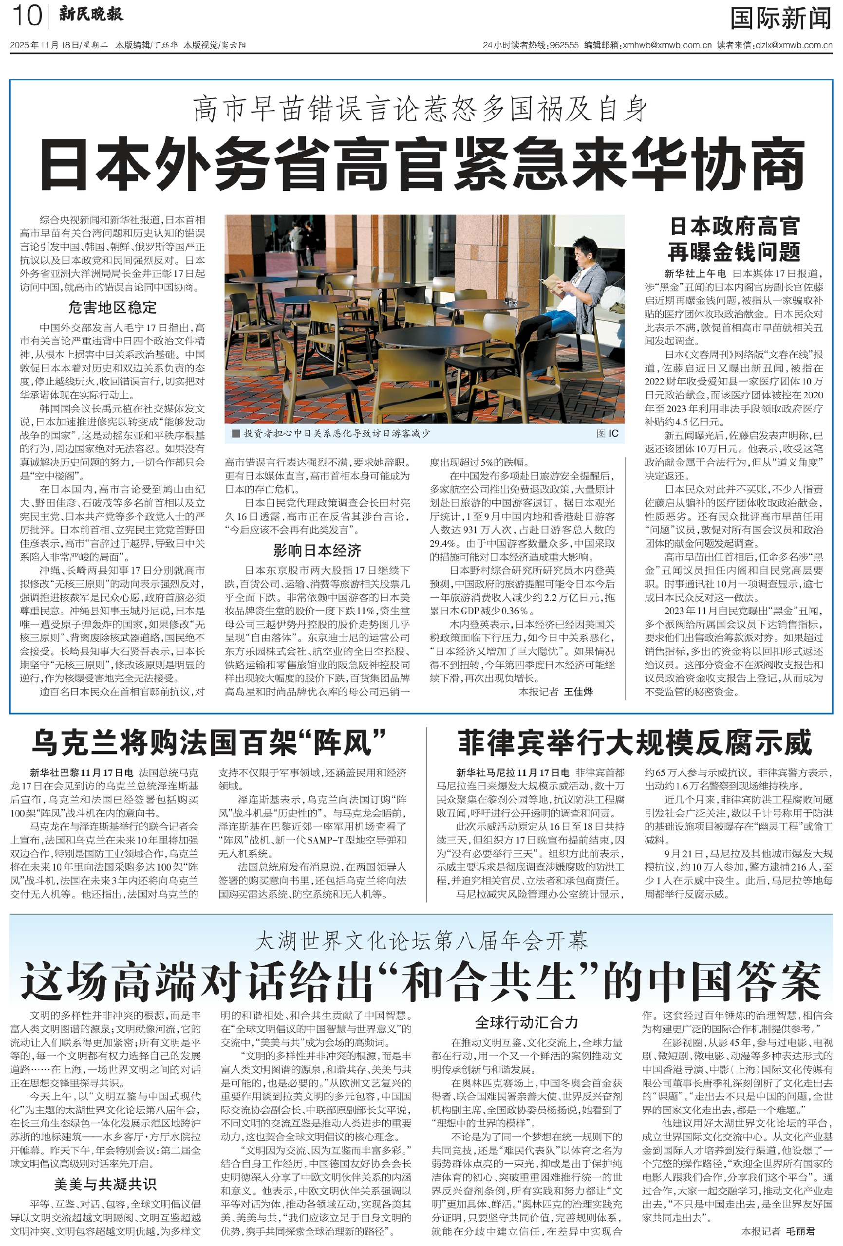 综合央视新闻和新华社报道,日本首相高市早苗有关台湾问题和历史认知的错误言论引发中国、韩国、朝鲜、俄罗斯等国严正抗议以及日本政党和民间强烈反对。日本外务省亚洲大洋洲局局长金井正彰17日起访问中国,就高市的错误言论同中国协商。
