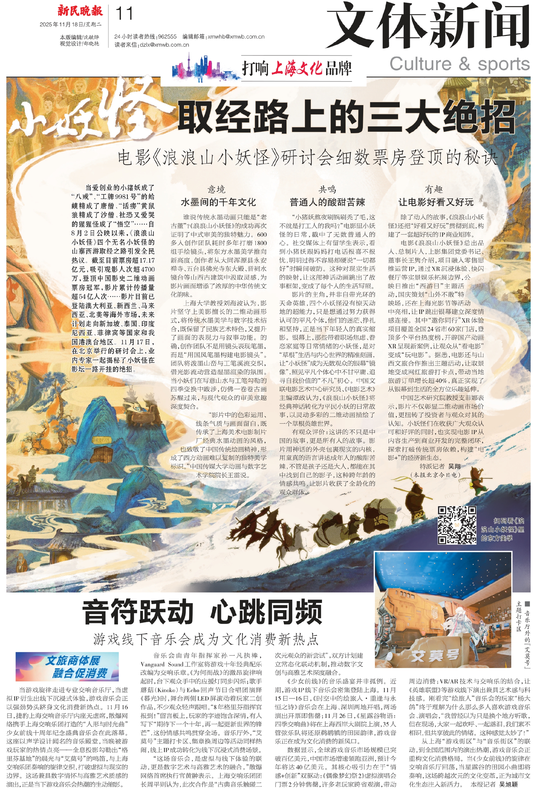 电影《浪浪山小妖怪》总出品人、总制片人,上影集团党委书记、董事长王隽介绍,项目融入零售思维运营IP,通过XR沉浸体验、快闪餐厅等实景娱乐拓展边界,公映日推出“西游日”主题活动,国庆策划“山外不散”特映场,还在上海光影节等活动中亮相,让IP跳出银幕建立深度情感连接。其中“邀你同行”XR体验项目覆盖全国24省市60家门店,登顶多个平台热度榜,开辟国产动画XR呈现新案例,让观众从“看电影”变成“玩电影”。据悉,电影还与山西文旅合作推出主题活动,让取景地变成网红旅游打卡点,带动当地旅游订单增长超40%,真正实现了从银幕到生活的全方位乐趣延伸。