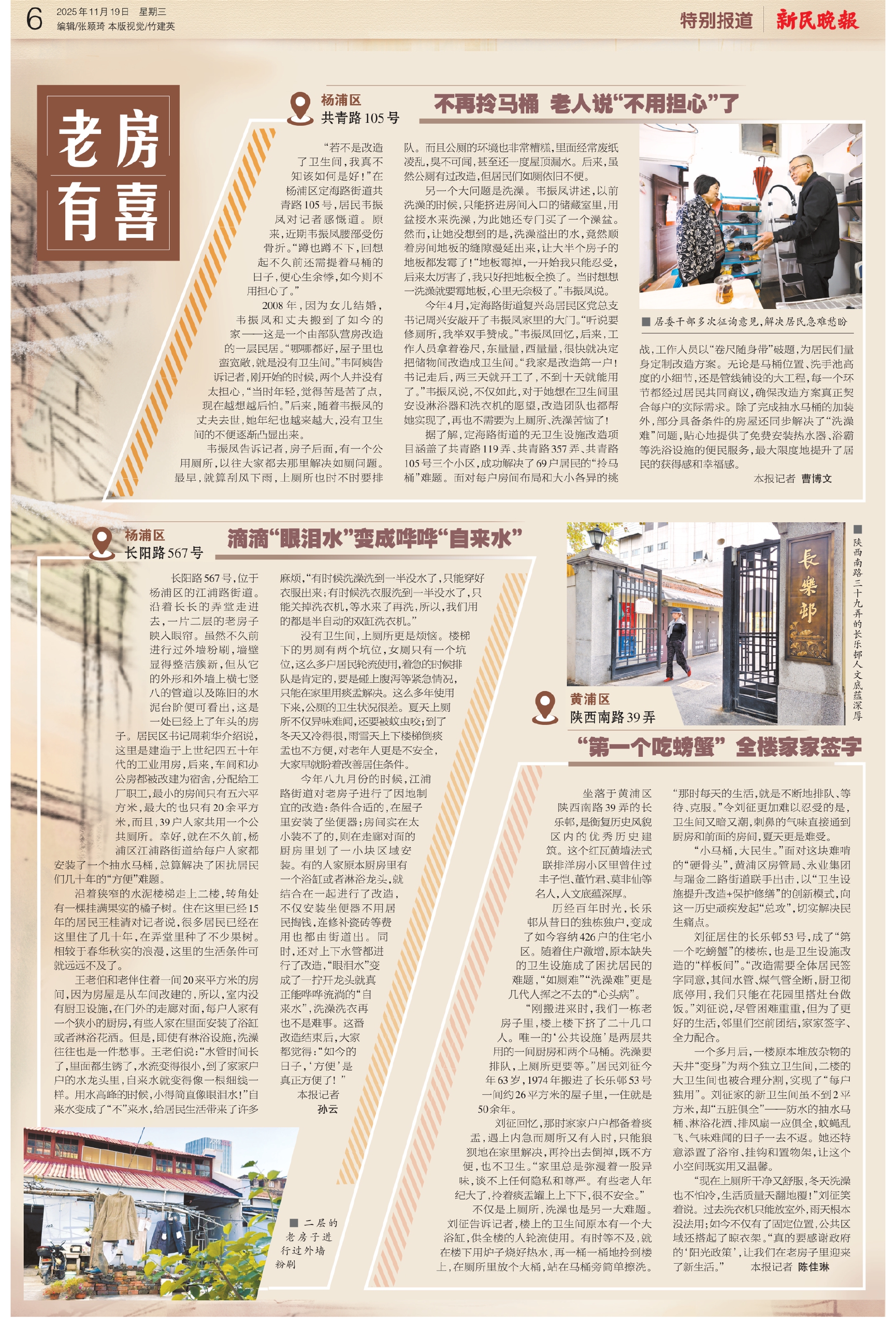 今年八九月份的时候,江浦路街道对老房子进行了因地制宜的改造:条件合适的,在屋子里安装了坐便器;房间实在太小装不了的,则在走廊对面的厨房里划了一小块区域安装。有的人家原本厨房里有一个浴缸或者淋浴龙头,就结合在一起进行了改造,不仅安装坐便器不用居民掏钱,连修补瓷砖等费用也都由街道出。同时,还对上下水管都进行了改造,“眼泪水”变成了一拧开龙头就真正能哗哗流淌的“自来水”,洗澡洗衣再也不是难事。这番改造结束后,大家都觉得:“如今的日子,‘方便’是真正方便了!”