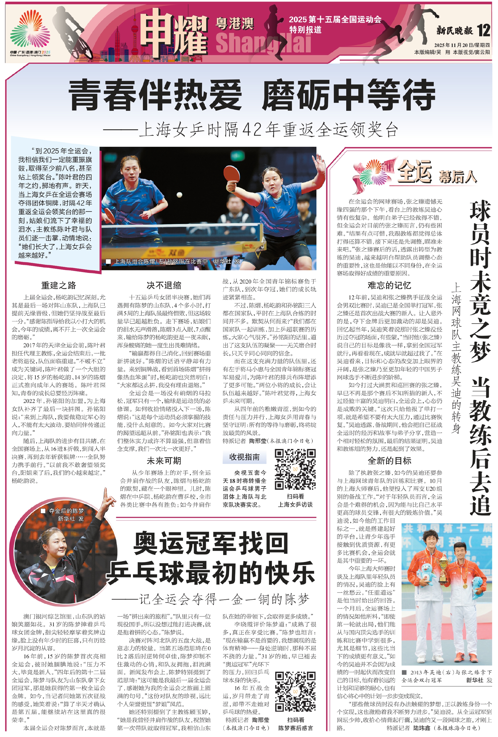 “到2025年全运会,我相信我们一定能重振旗鼓,取得至少前八名,甚至站上领奖台。”陈叶君的四年之约,掷地有声。昨天,当上海女乒在全运会赛场夺得团体铜牌,时隔42年重返全运会领奖台的那一刻,姑娘们流下了幸福的泪水,主教练陈叶君与队员们逐一击掌,动情地说:“她们长大了,上海女乒会越来越好。”