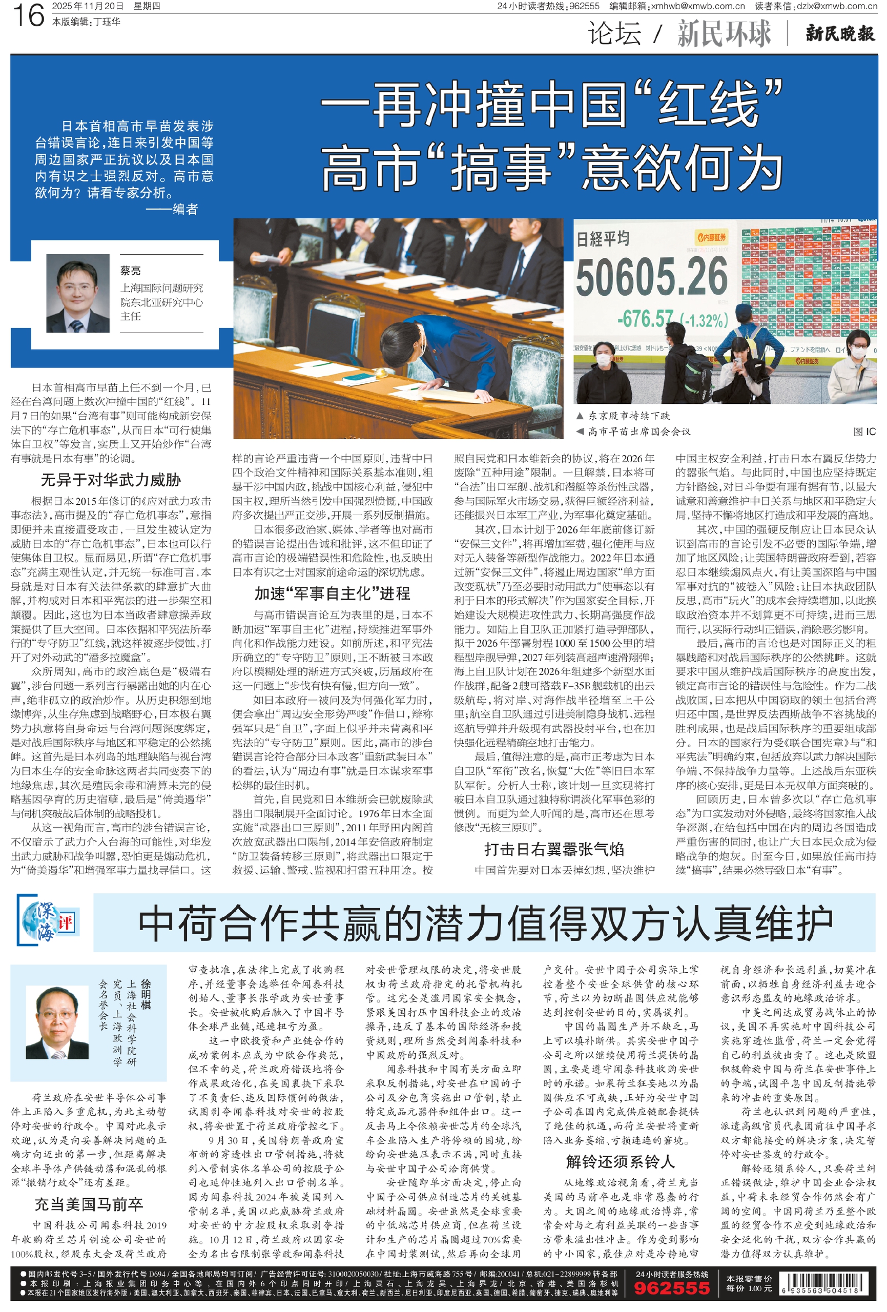 日本很多政治家、媒体、学者等也对高市的错误言论提出告诫和批评,这不但印证了高市言论的极端错误性和危险性,也反映出日本有识之士对国家前途命运的深切忧虑。