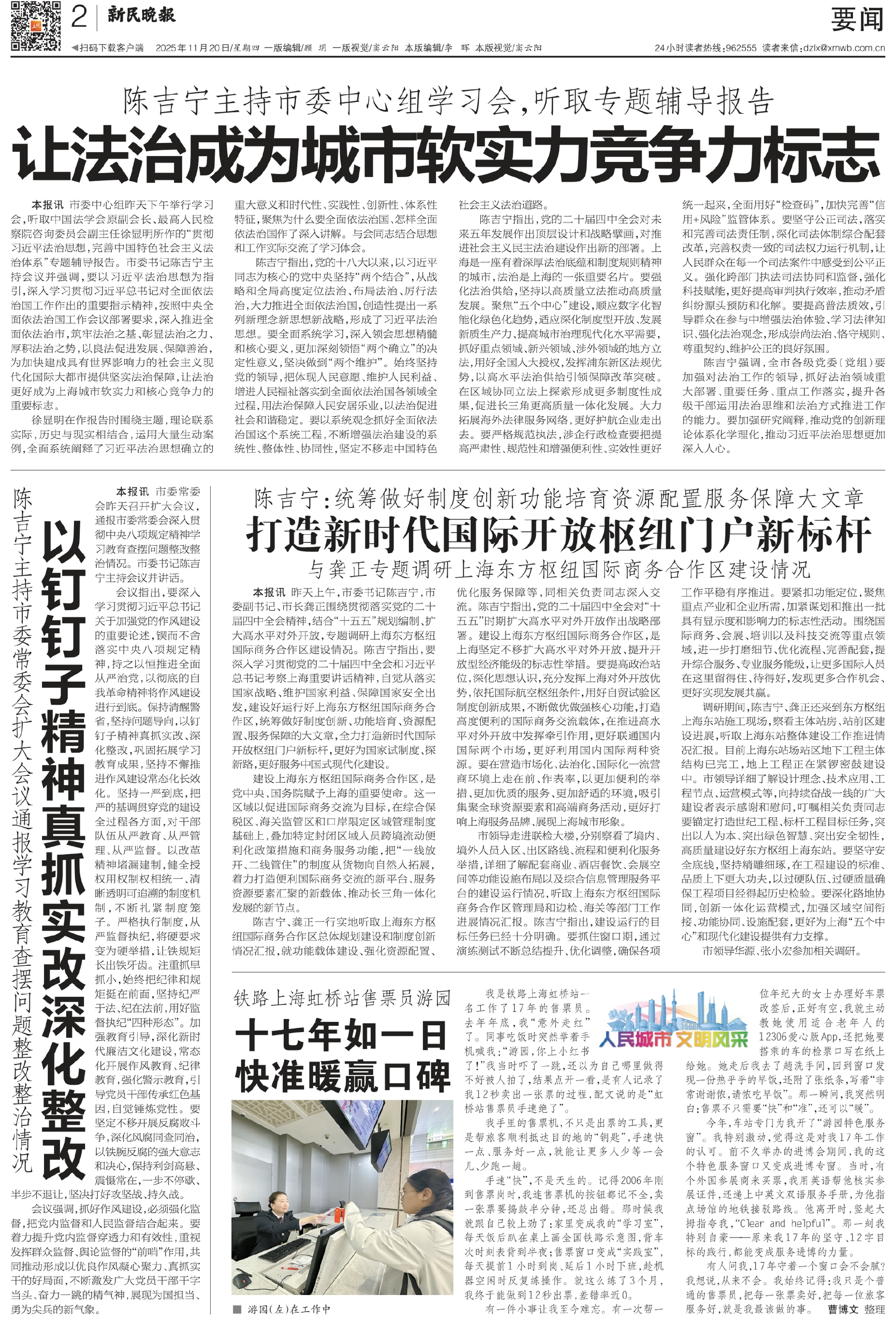 陈吉宁指出,党的二十届四中全会对未来五年发展作出顶层设计和战略擘画,对推进社会主义民主法治建设作出新的部署。上海是一座有着深厚法治底蕴和制度规则精神的城市,法治是上海的一张重要名片。要强化法治供给,坚持以高质量立法推动高质量发展。聚焦“五个中心”建设,顺应数字化智能化绿色化趋势,适应深化制度型开放、发展新质生产力、提高城市治理现代化水平需要,抓好重点领域、新兴领域、涉外领域的地方立法,用好全国人大授权,发挥浦东新区法规优势,以高水平法治供给引领保障改革突破。在区域协同立法上探索形成更多制度性成果,促进长三角更高质量一体化发展。大力拓展海外法律服务网络,更好护航企业走出去。要严格规范执法,涉企行政检查要把提高严肃性、规范性和增强便利性、实效性更好统一起来,全面用好“检查码”,加快完善“信用+风险”监管体系。要坚守公正司法,落实和完善司法责任制,深化司法体制综合配套改革,完善权责一致的司法权力运行机制,让人民群众在每一个司法案件中感受到公平正义。强化跨部门执法司法协同和监督,强化科技赋能,更好提高审判执行效率,推动矛盾纠纷源头预防和化解。要提高普法质效,引导群众在参与中增强法治体验、学习法律知识、强化法治观念,形成崇尚法治、恪守规则、尊重契约、维护公正的良好氛围。