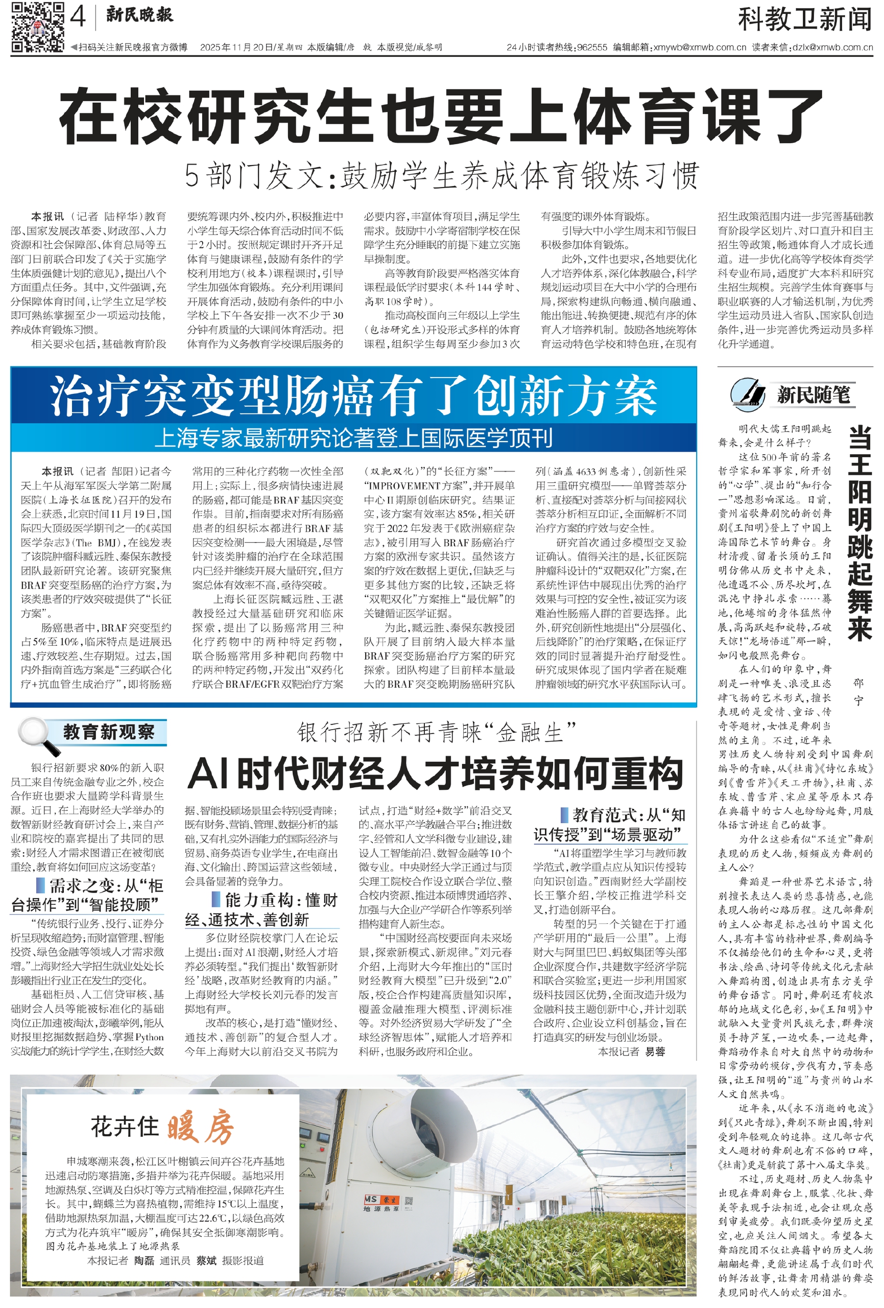 本报讯(记者 陆梓华)教育部、国家发展改革委、财政部、人力资源和社会保障部、体育总局等五部门日前联合印发了《关于实施学生体质强健计划的意见》,提出八个方面重点任务。其中,文件强调,充分保障体育时间,让学生立足学校即可熟练掌握至少一项运动技能,养成体育锻炼习惯。