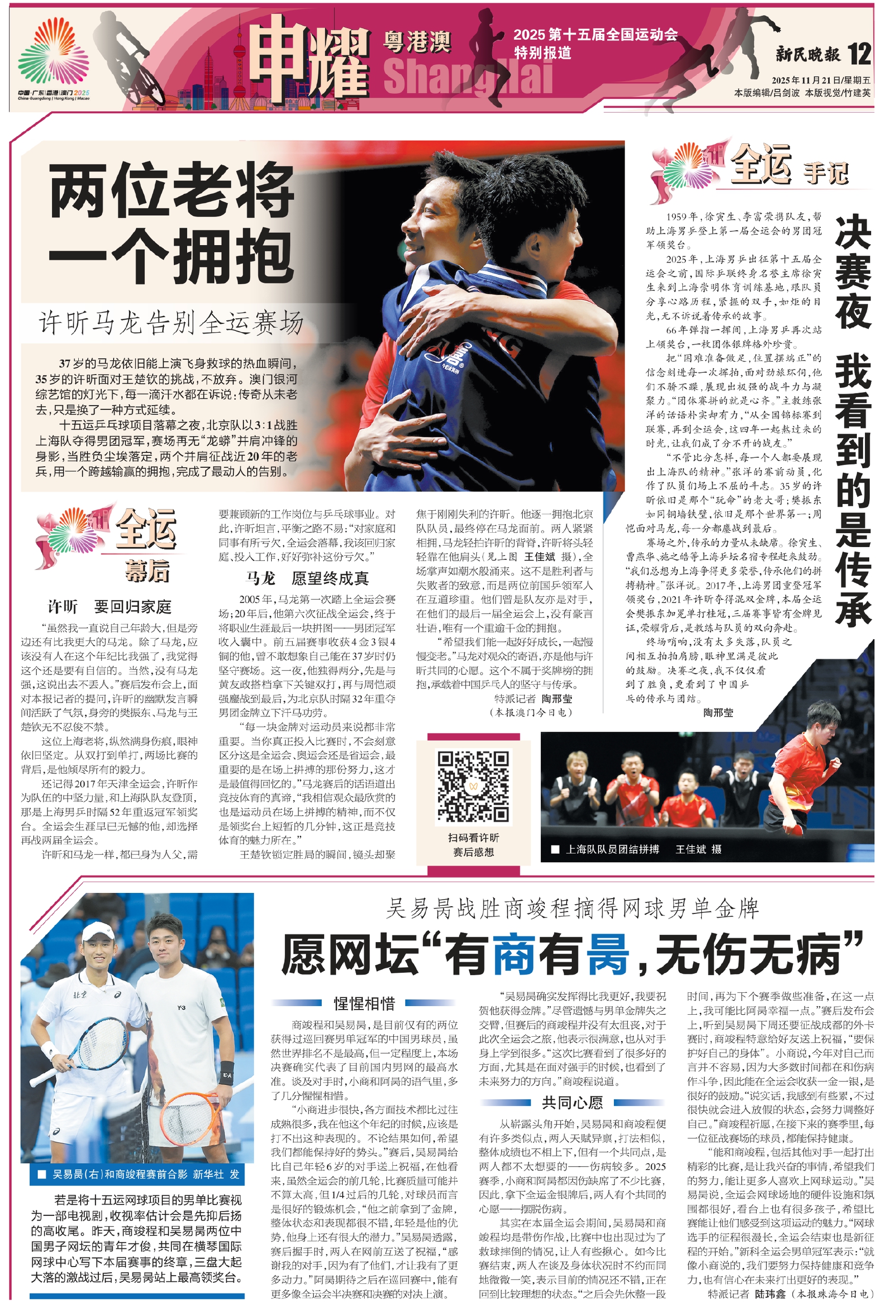 王楚钦锁定胜局的瞬间,镜头却聚焦于刚刚失利的许昕。他逐一拥抱北京队队员,最终停在马龙面前。两人紧紧相拥,马龙轻拍许昕的背脊,许昕将头轻轻靠在他肩头(见上图 王佳斌 摄),全场掌声如潮水般涌来。这不是胜利者与失败者的致意,而是两位前国乒领军人在互道珍重。他们曾是队友亦是对手,在他们的最后一届全运会上,没有豪言壮语,唯有一个重逾千金的拥抱。