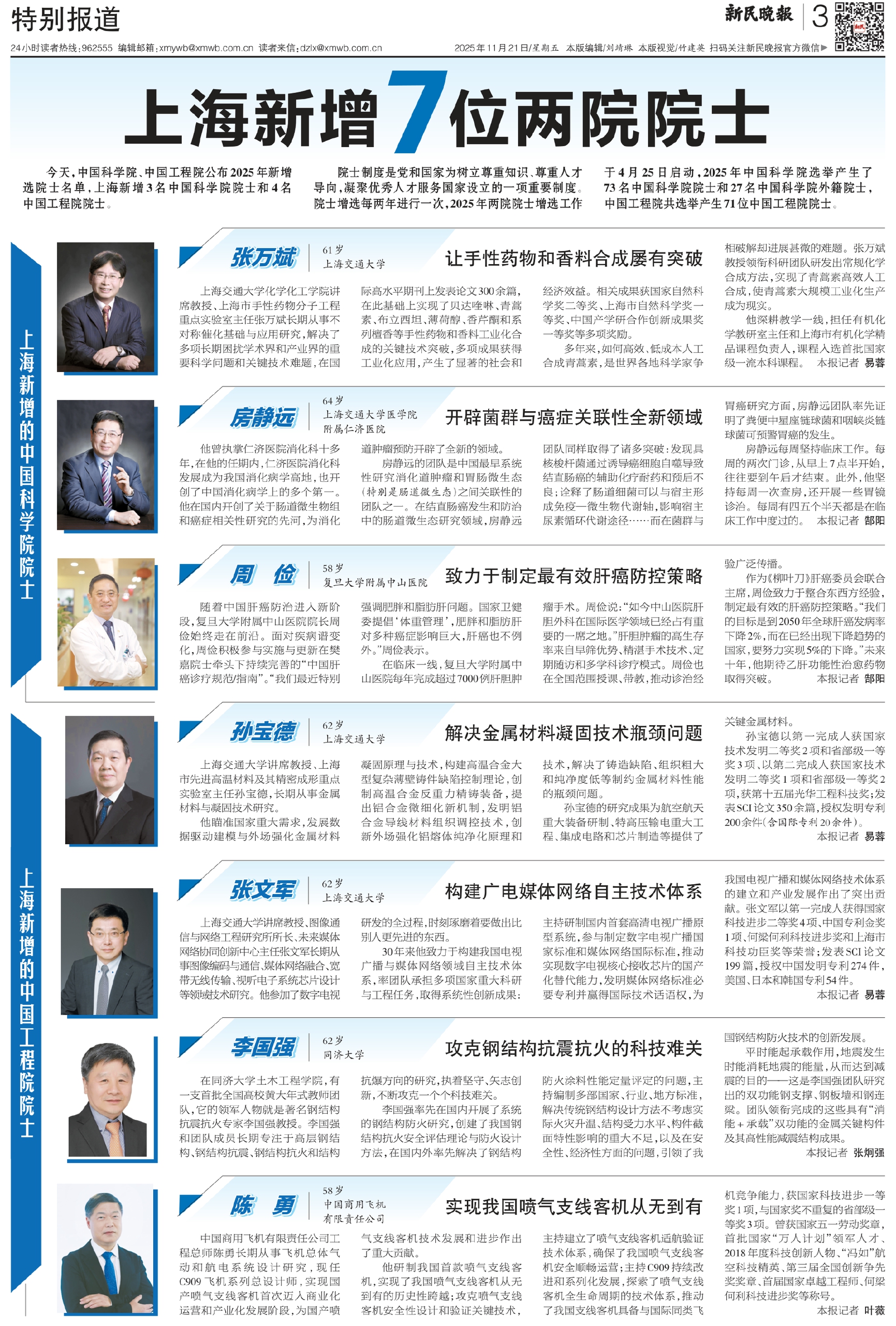 今天,中国科学院、中国工程院公布2025年新增选院士名单,上海新增3名中国科学院院士和4名中国工程院院士。