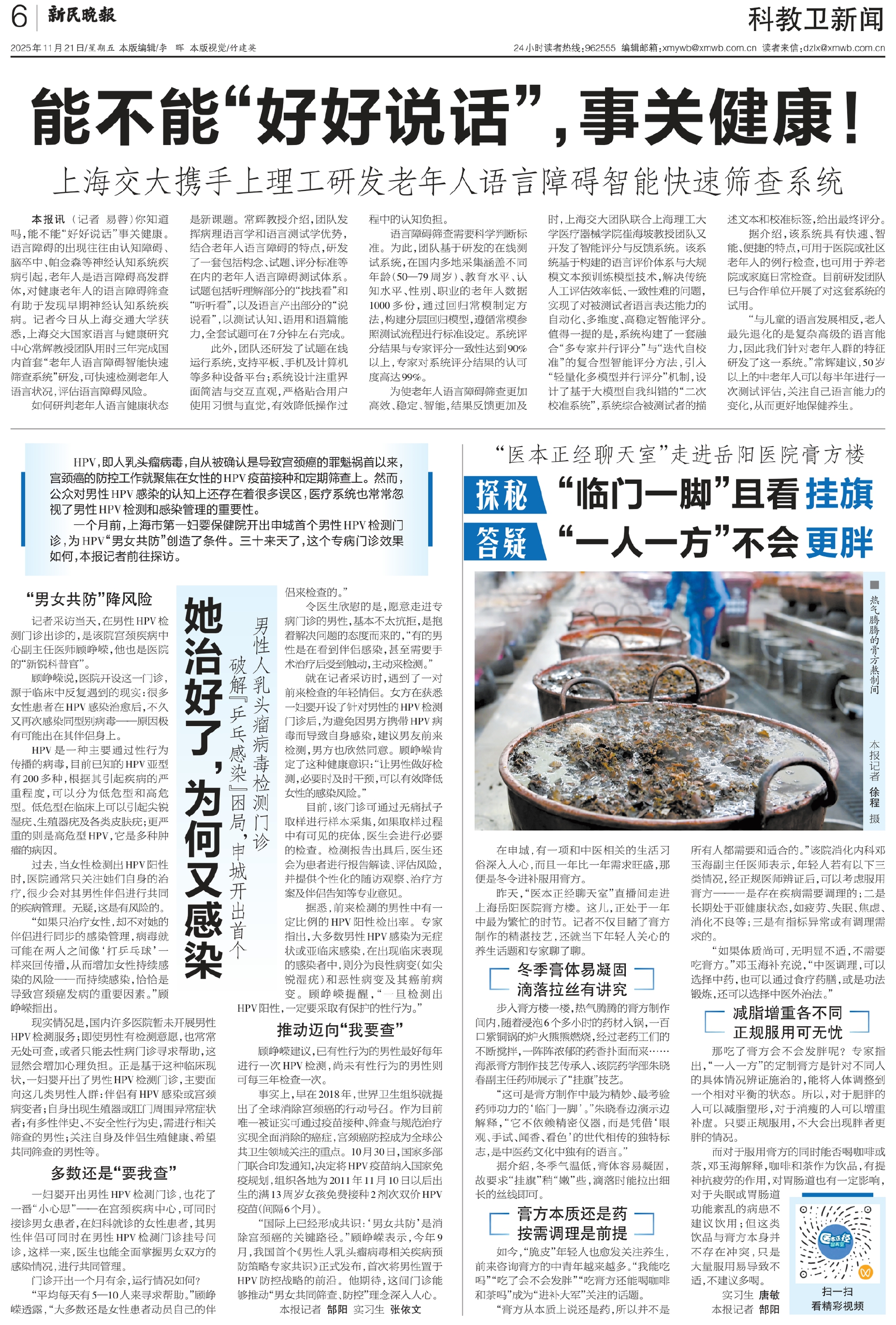本报讯(记者 易蓉)你知道吗,能不能“好好说话”事关健康。语言障碍的出现往往由认知障碍、脑卒中、帕金森等神经认知系统疾病引起,老年人是语言障碍高发群体,对健康老年人的语言障碍筛查有助于发现早期神经认知系统疾病。记者今日从上海交通大学获悉,上海交大国家语言与健康研究中心常辉教授团队用时三年完成国内首套“老年人语言障碍智能快速筛查系统”研发,可快速检测老年人语言状况,评估语言障碍风险。