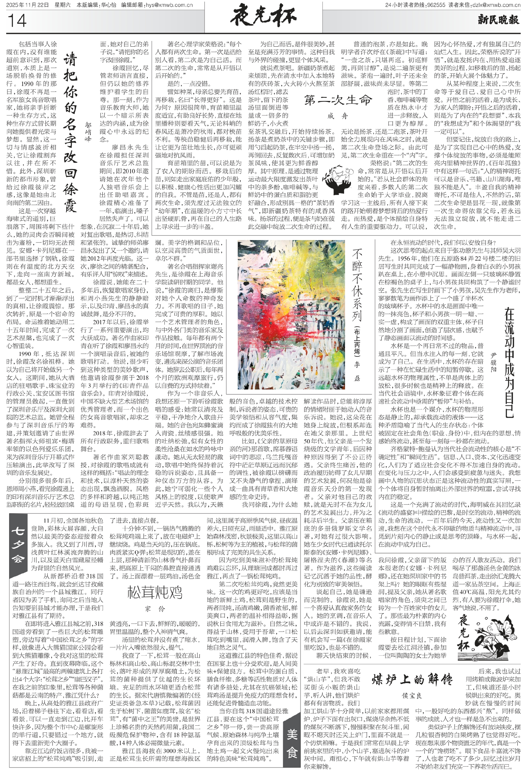 按日程计划,下面徐霞要去松江洞泾镇,参加一位叫陶陶的女士为她举办的百人歌友活动。我们喝尽了那盏汤色金黄的冰岛普洱茶,走出徐汇龙腾大道一家品茶空间。上海正值40℃高温,阳光尤其灼烈,有人要为徐霞打伞,她客气地说,不用了。