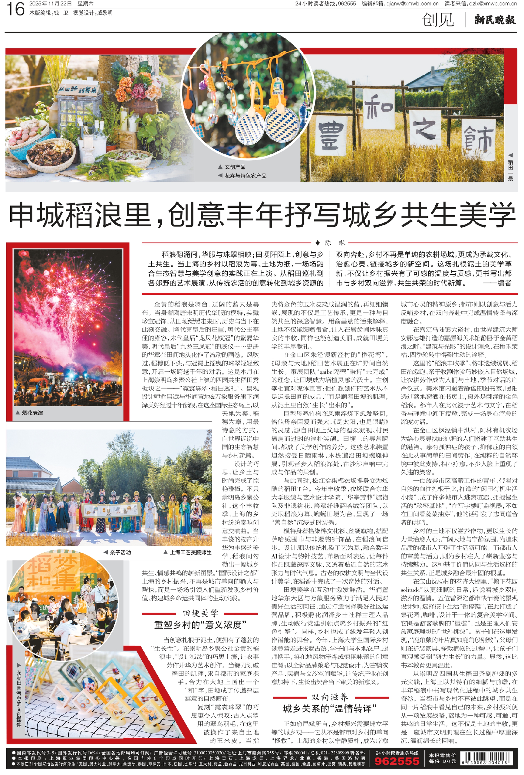 稻浪翻涌间,华服与珠翠相映;田埂阡陌上,创意与乡土共生。当上海的乡村以稻浪为幕、土地为纸,一场场融合生态智慧与美学创意的实践正在上演。从稻田巡礼到各郊野的艺术展演,从传统农活的创意转化到城乡资源的双向奔赴,乡村不再是单纯的农耕场域,更成为承载文化、治愈心灵、链接城乡的新空间。这场扎根泥土的美学革新,不仅让乡村振兴有了可感的温度与质感,更书写出都市与乡村双向滋养、共生共荣的时代新篇。 ——编者